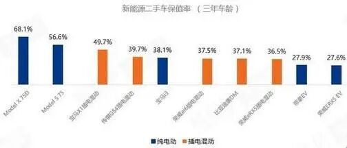 具体到车型方面,技术先进和成熟的车型保值率较高。如新能源二手车保值率一直居首位的有特斯拉的model X、modelS,三年车龄残值依然可有五六成,Model X75D甚至高达68.1%,媲美传统燃油车。除特斯拉外,三年残值较高的新能源汽车则基本产自传统车企,宝马X1混动、i3,广汽传祺GS4插电混动、荣威ei6插电混动、比亚迪唐DM、帝豪EV等都在新能源保值率前十。