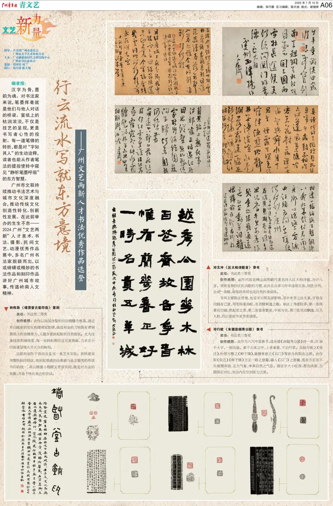 广州市文联持续推动书法艺术与城市文化深度融合,推动传统文化创造性转化、创新性发展。在此前举办的生生不息——2024广州“文艺两新”人才美术、书法、摄影、民间文艺、动漫优秀作品展中,多名广州书法家脱颖而出,以或磅礴或精妙的书法作品和刻印作品讲好广州城市故事,传递岭南人文精神。