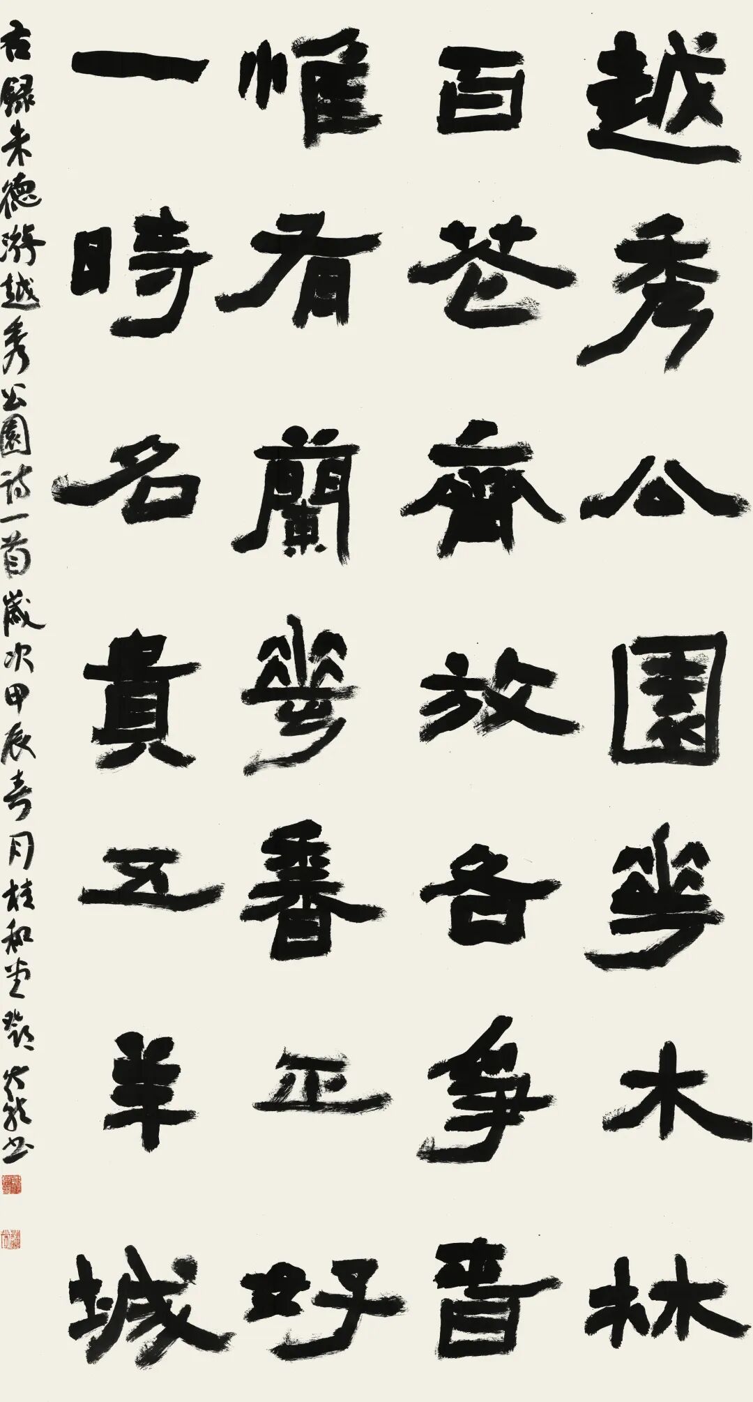 创作感想:此作为六尺中堂隶书,选朱德《游越秀公园》诗一首,共28个大字,一挥而就。隶于五体之中,上承秦篆,下启行草。古拙方峻之《张迁》,朴厚方整之《鲜于璜》,雄健率意之《石门》等皆为我取法之源。此作取《张迁》《鲜于璜》方正一路之意蕴,融入《石门》之意趣,追求方正而不失雄健奔放、正大气象、率真自然之气息。强化字大小收放、墨色块面、方圆倚正对比,突出内在空间张力之美。