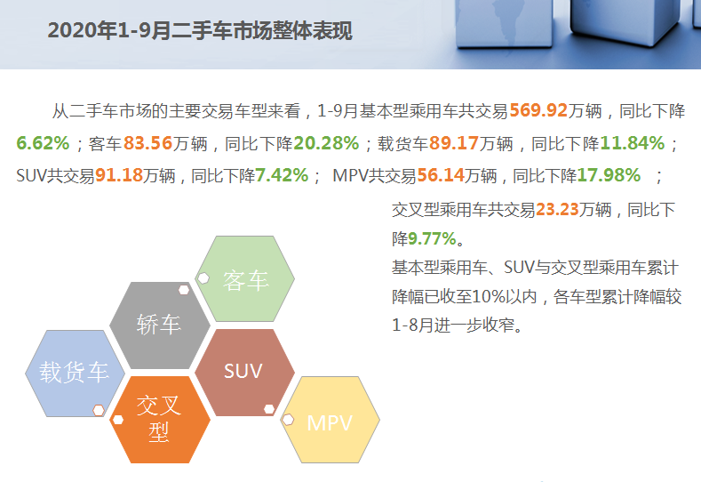 从二手车市场的主要交易车型来看,1-9月基本型乘用车共交易569.92万辆,同比下降6.62%;客车83.56万辆,同比下降20.28%;载货车89.17万辆,同比下降11.84%;SUV共交易91.18万辆,同比下降7.42%;MPV共交易56.14万辆,同比下降17.98%