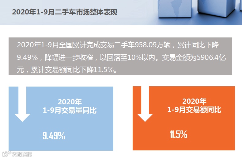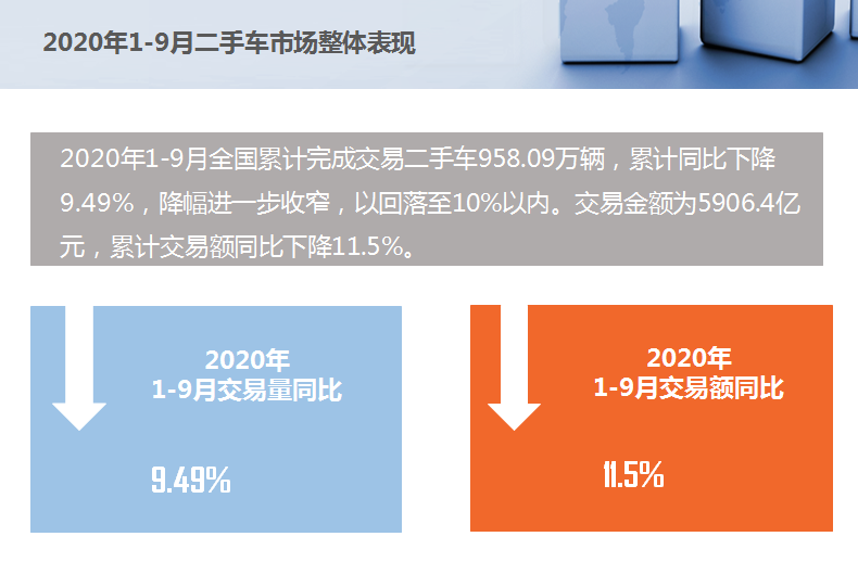 2020年1-9月全国累计完成交易二手车958.09万辆,累计同比下降9.49%,降幅进一步收窄,以回落至10%以内。交易金额为5906.4亿元,累计交易额同比下降11.5%。