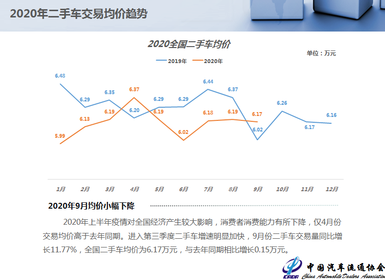 2020年上半年疫情对全国经济产生较大影响,消费者消费能力有所下降,仅4月份交易均价高于去年同期。进入第三季度二手车增速明显加快,9月份二手车交易量同比增长11.77%,全国二手车均价为6.17万元,与去年同期相比增长0.15万元。
