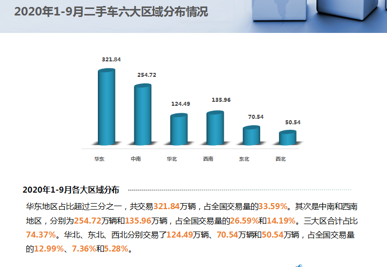 华东地区占比超过三分之一,共交易321.84万辆,占全国交易量的33.59%。其次是中南和西南地区,分别为254.72万辆和135.96万辆,占全国交易量的26.59%和14.19%。三大区合计占比74.37%。华北、东北、西北分别交易了124.49万辆、70.54万辆和50.54万辆,占全国交易量的12.99%、7.36%和5.28%。