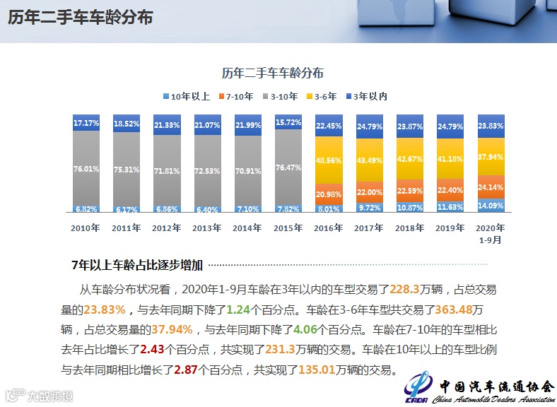 从车龄分布状况看,2020年1-9月车龄在3年以内的车型交易了228.3万辆,占总交易量的23.83%,与去年同期下降了1.24个百分点。车龄在3-6年车型共交易了363.48万辆,占总交易量的37.94%,与去年同期下降了4.06个百分点。车龄在7-10年的车型相比去年占比增长了2.43个百分点,共实现了231.3万辆的交易。车龄在10年以上的车型比例与去年同期相比增长了2.87个百分点,共实现了135.01万辆的交易。