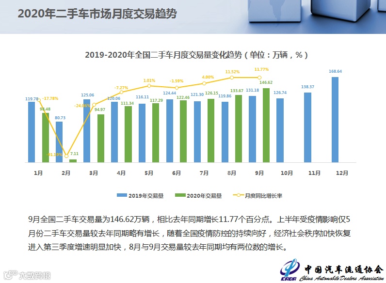 9月全国二手车交易量为146.62万辆,相比去年同期增长11.77个百分点。上半年受疫情影响仅5月份二手车交易量较去年同期略有增长,随着全国疫情防控的持续向好,经济社会秩序加快恢复进入第三季度增速明显加快,8月与9月交易量较去年同期均有两位数的增长。
