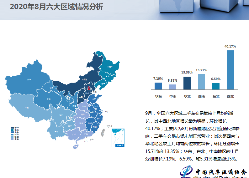 9月,全国六大区域二手车交易量较上月均所增长,其中西北地区增长最为明显,环比增长40.17%;主要因为8月份新疆地区受到疫情反弹影响,二手车交易市场未能正常营业;其次是西南与华北地区较上月均有两位数的增长,环比分别增长15.71%和13.35%;华东、东北、中南地区较上月分别增长7.19%、6.59%、和5.31%增速超过5%。