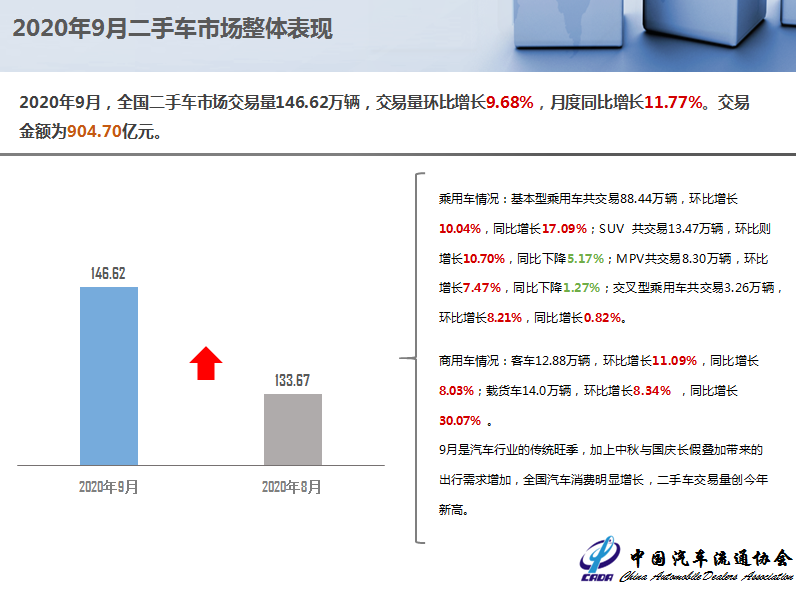 2020年9月,全国二手车市场交易量146.62万辆,交易量环比增长9.68%,月度同比增长11.77%。交易金额为904.70亿元。