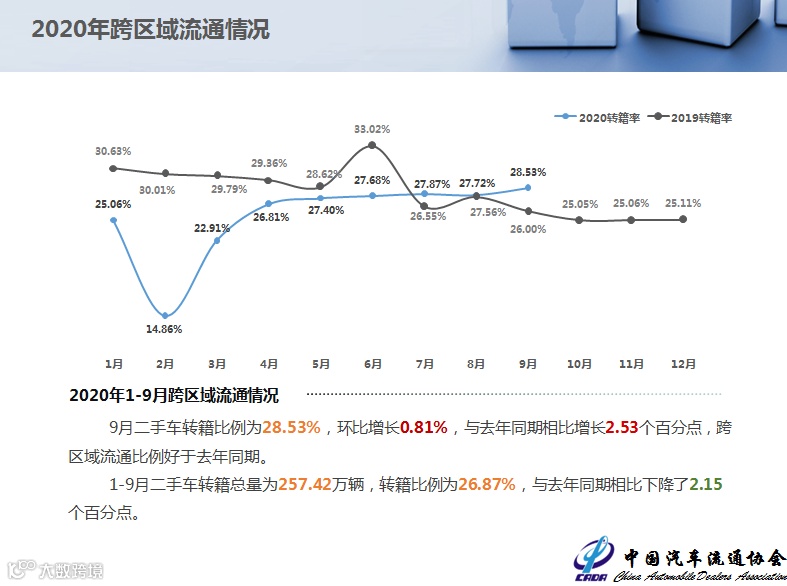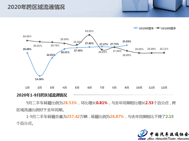 9月二手车转籍比例为28.53%,环比增长0.81%,与去年同期相比增长2.53个百分点,跨区域流通比例好于去年同期。