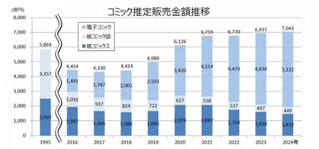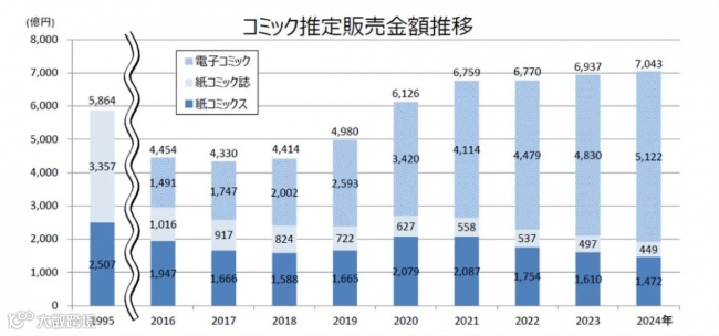 与纸质漫画形成鲜明对比的是电子漫画市场的快速增长。2024年,电子漫画销售额同比上涨6.0%,达到5122亿日元,并与2019年相比几乎翻番。值得关注的是: