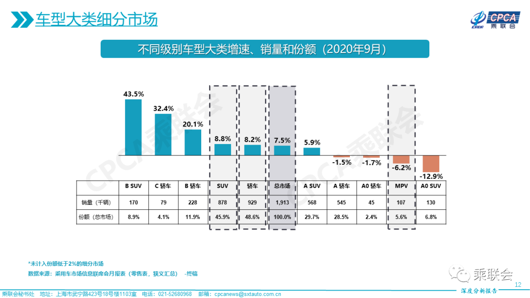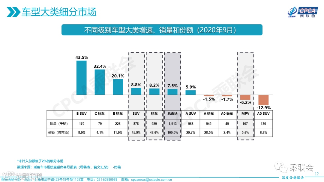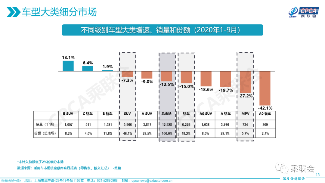 不同级别车型大类增速、销量和份额——2020年9月及累计
