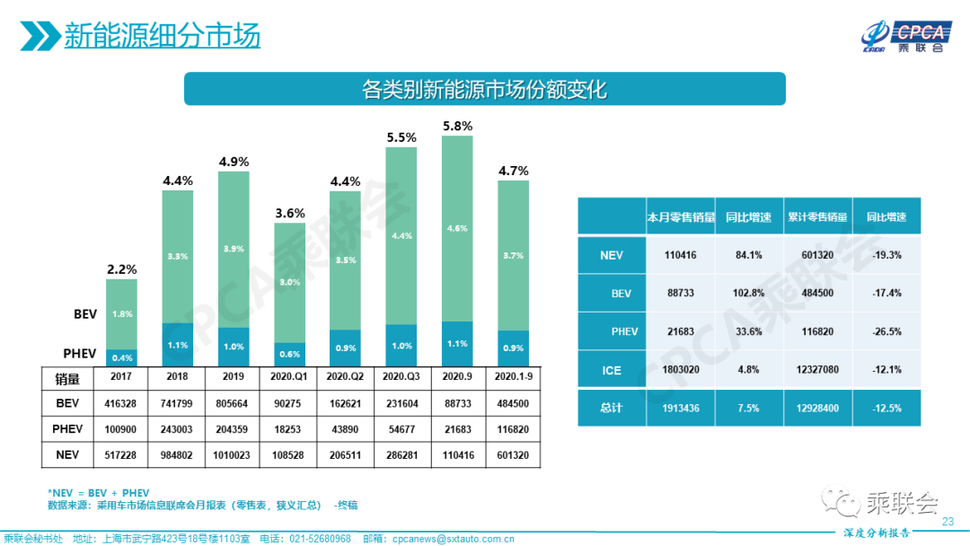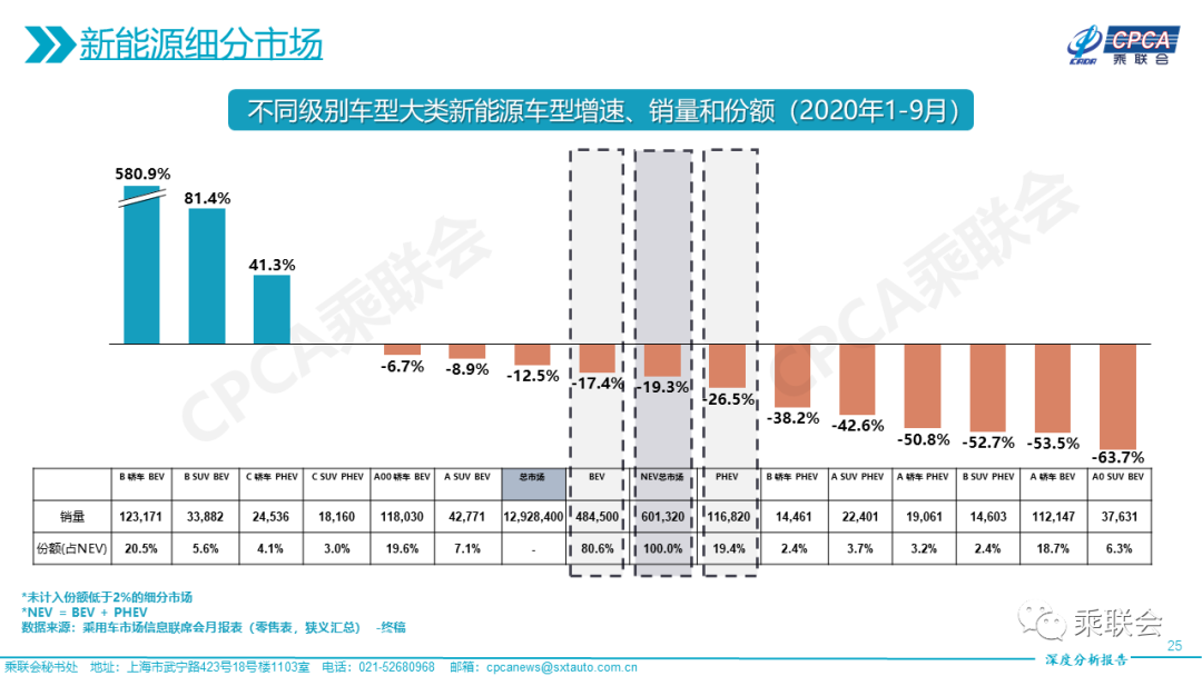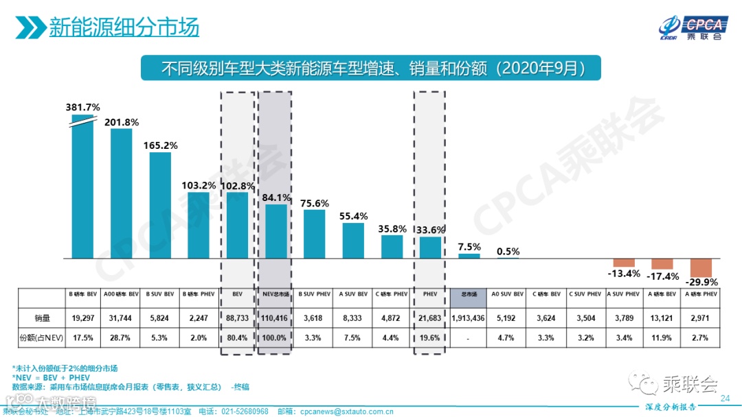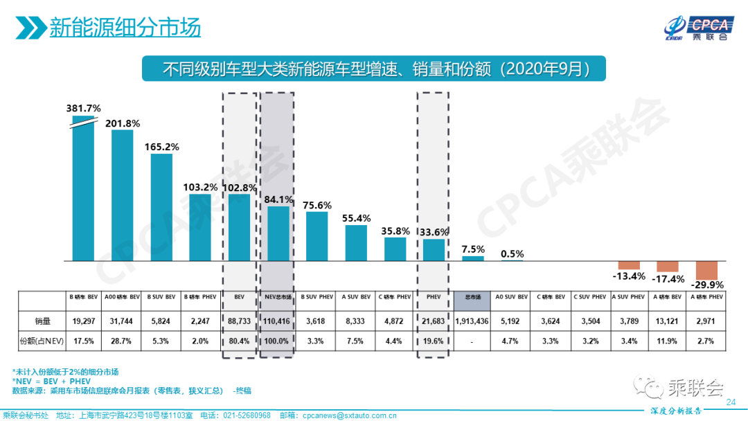 不同级别车型大类新能源车型增速、销量和份额——2020年9月及累计