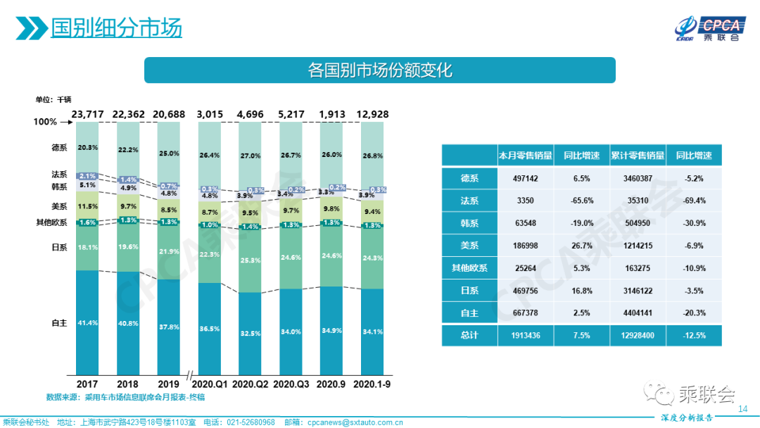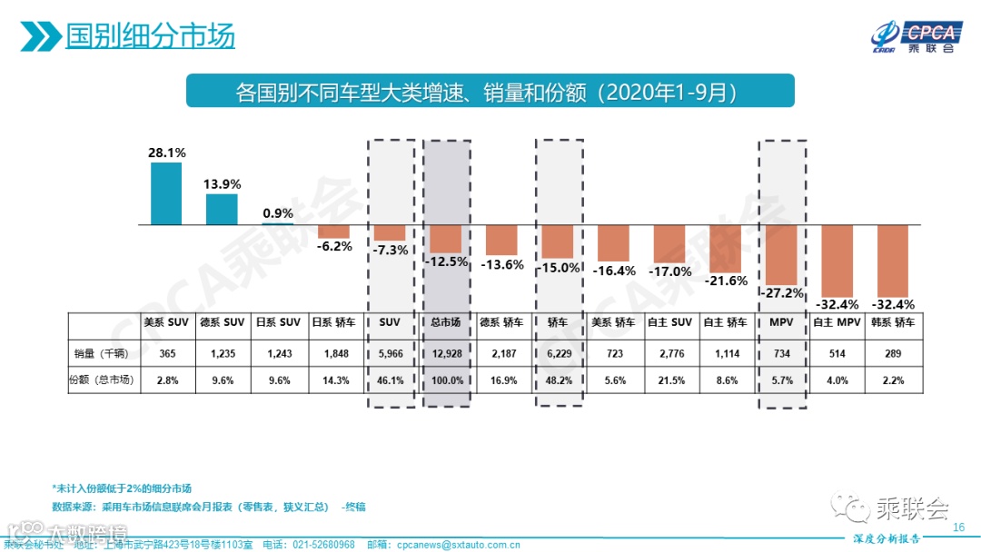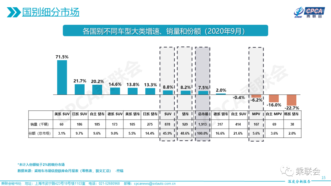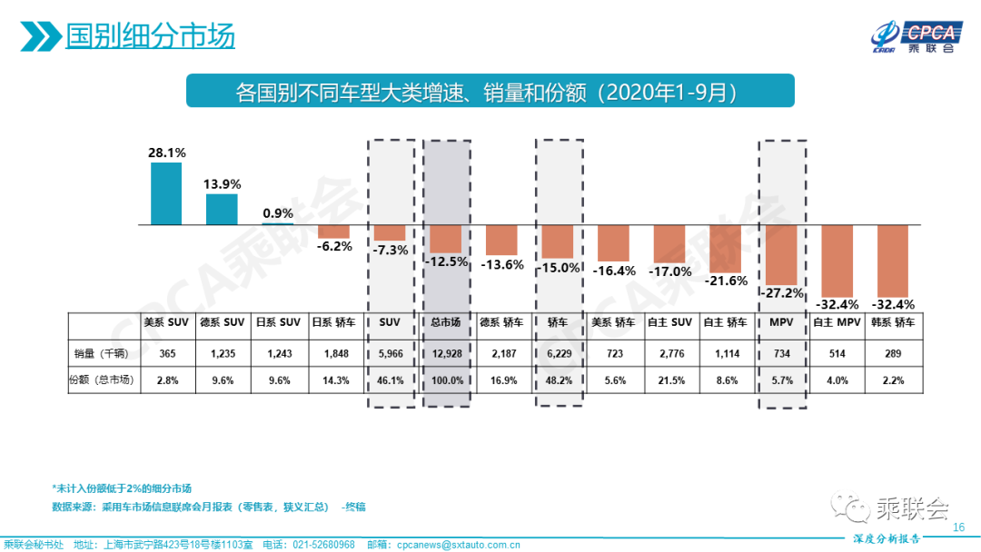 各国别不同车型大类增速、销量和份额——2020年9月及累计
