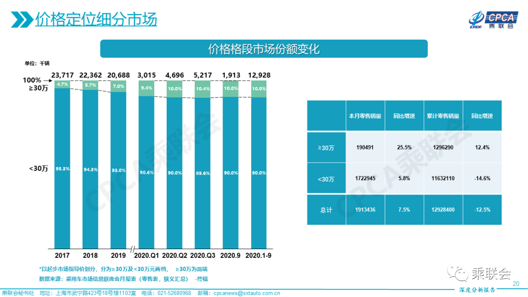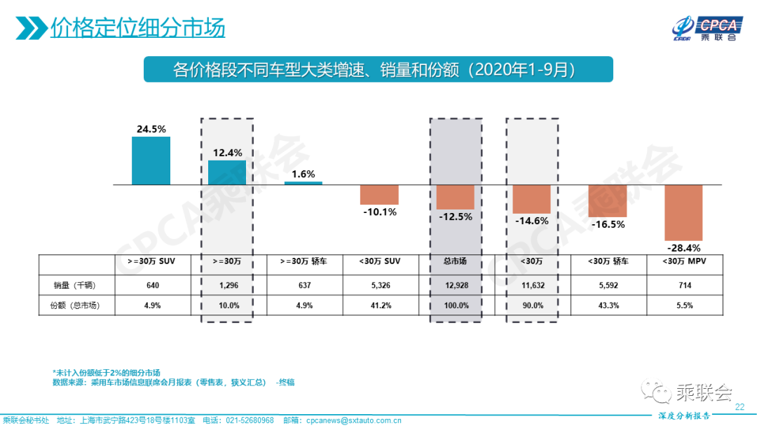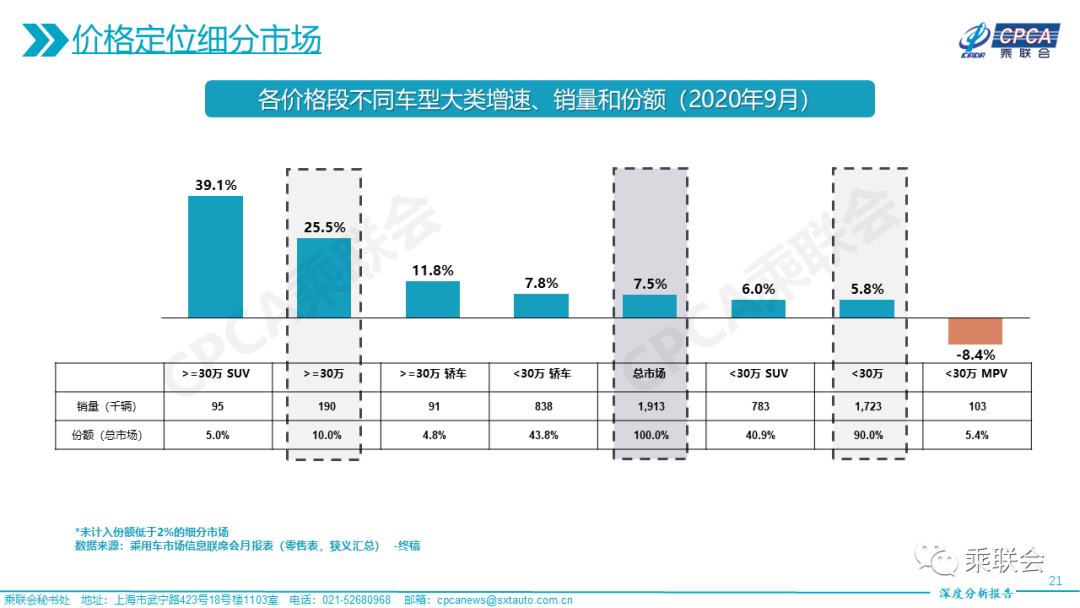 各价格段不同车型大类增速、销量和份额——2020年9月及累计