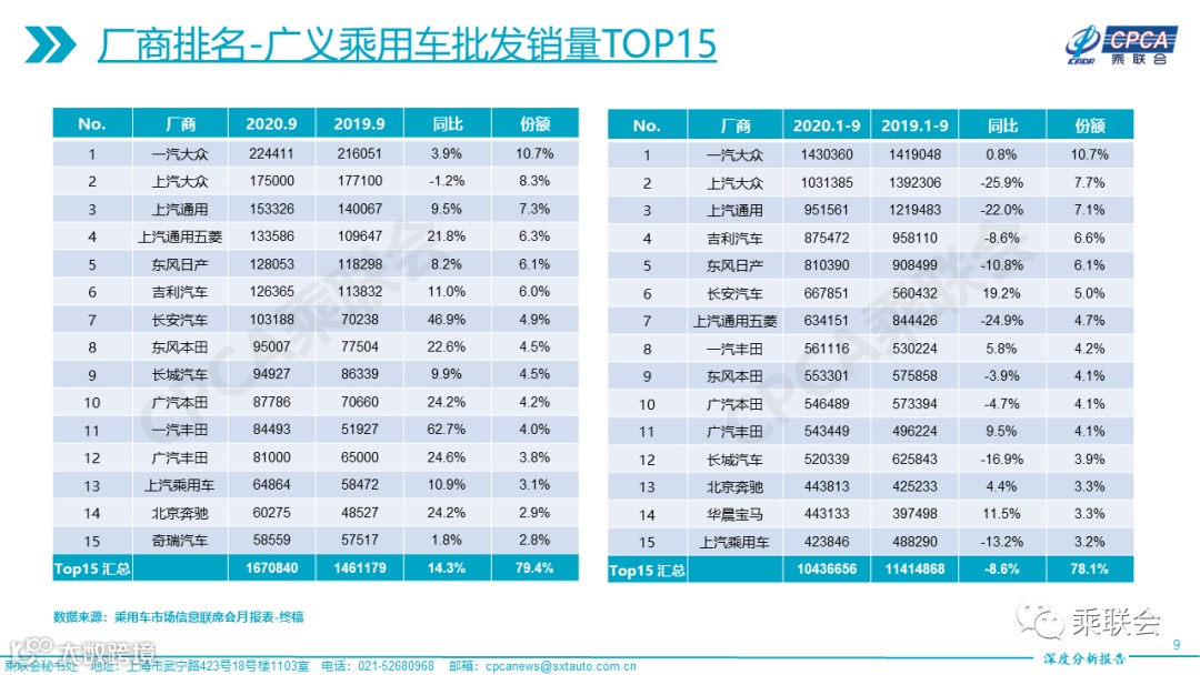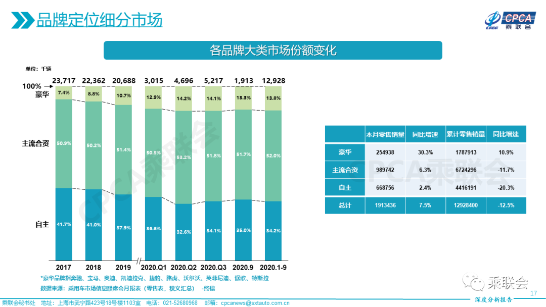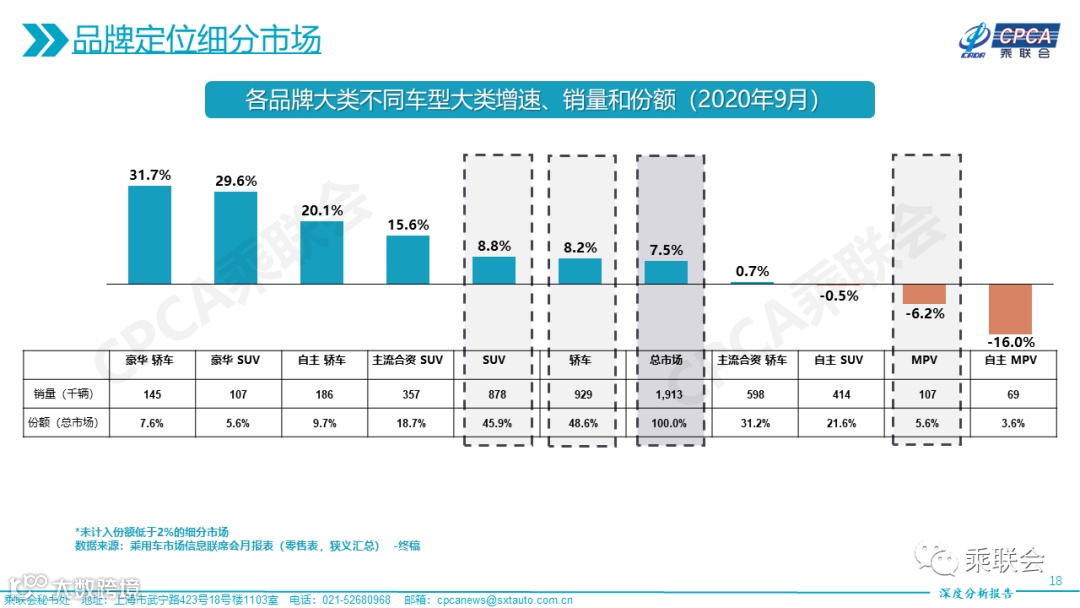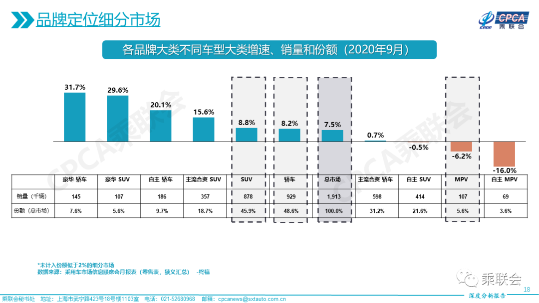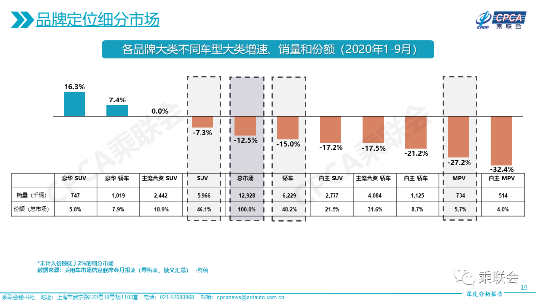 各品牌大类下不同车型大类增速、销量和份额——2020年9月及累计