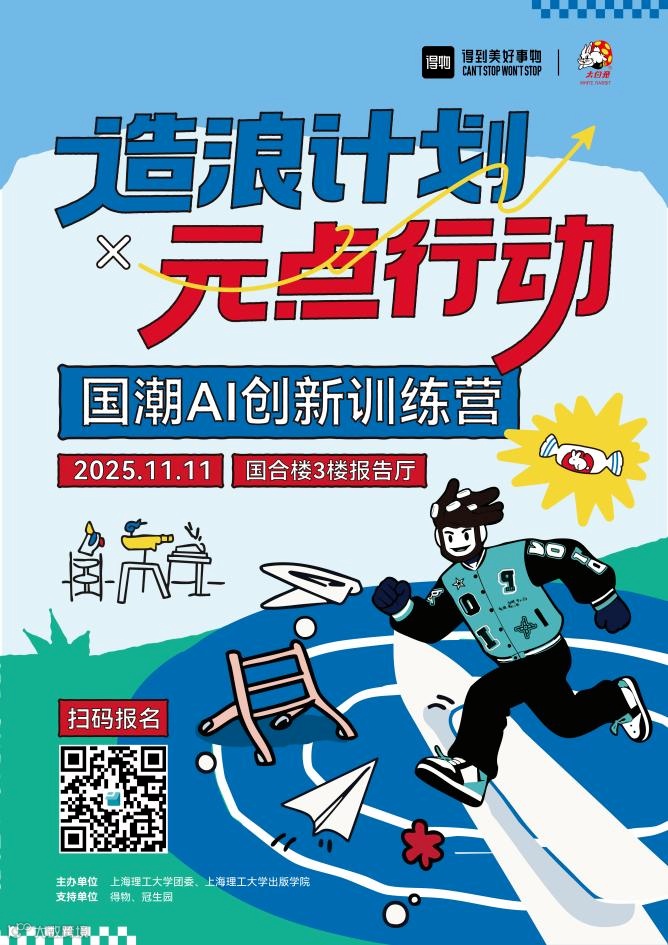 为积极响应上海市“工赋链主”培育计划,推动老字号品牌数字化转型与青年创意人才培养,我校将联合得物平台及上海老字号品牌“大白兔”,共同开展“造浪计划×元点行动——国潮AI创新训练营。现将有关事项通知如下: