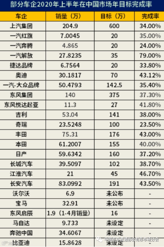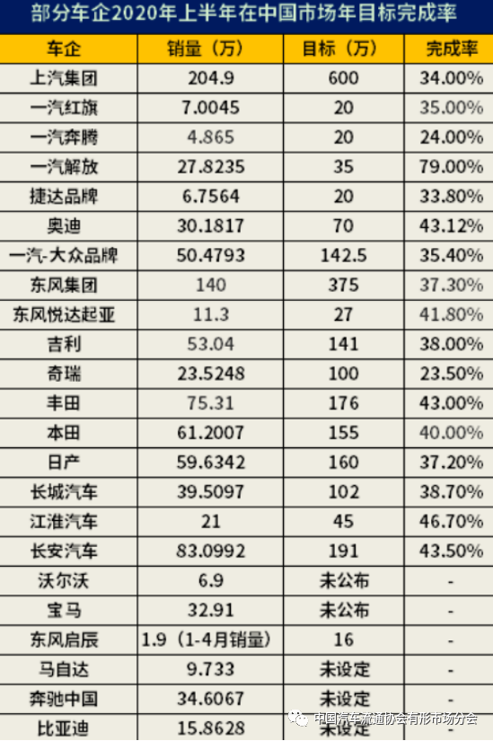 2020年上半年,销量目标完成率超过五成的企业几乎没有;完成率超过四成的仅有4家车企;绝大多数车企半年完成率在30%-40%之间;完成率垫底的是奇瑞汽车,其将全年销量目标调低10万辆后,上半年仅完成23%,目标完成度最高的是一汽解放79%。(来源:网络综合)
