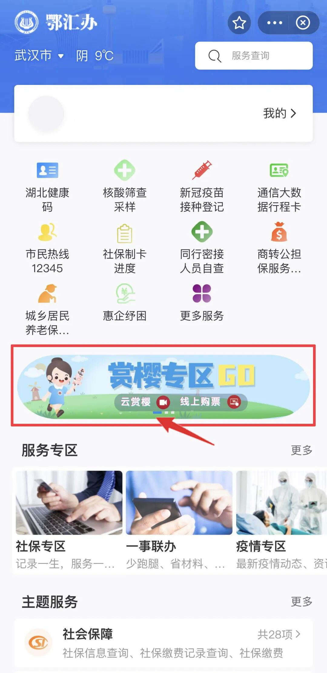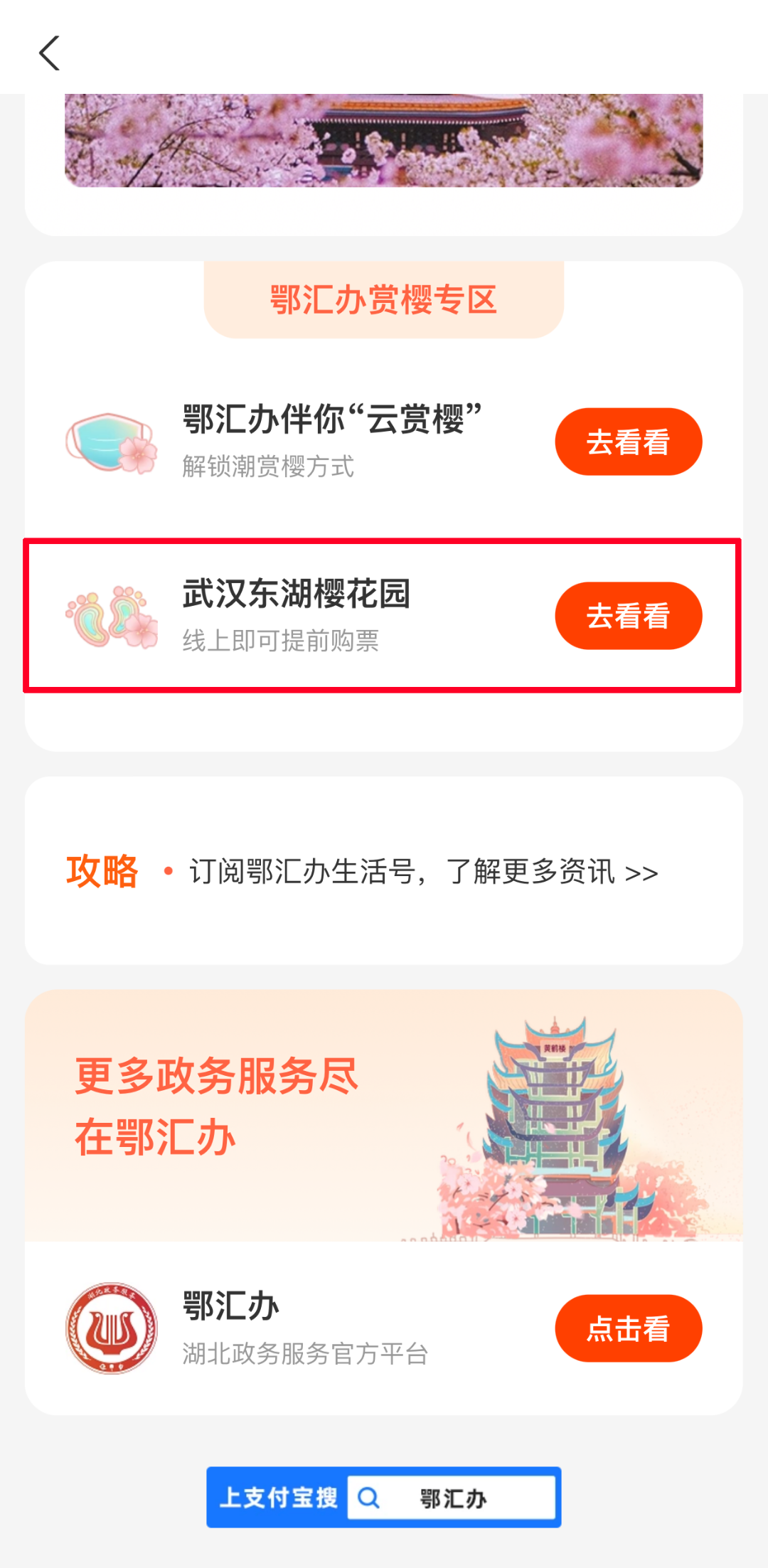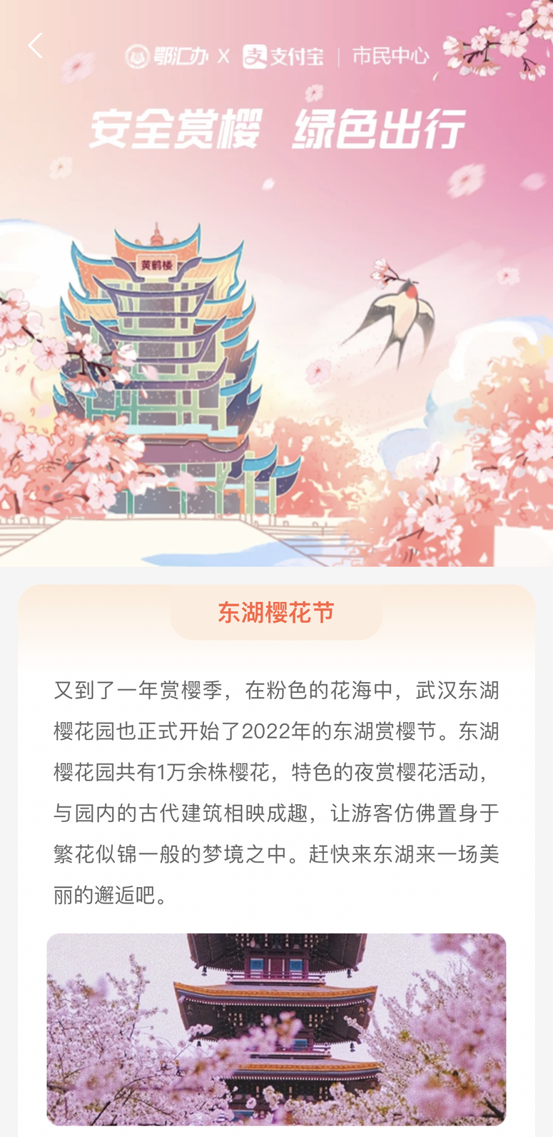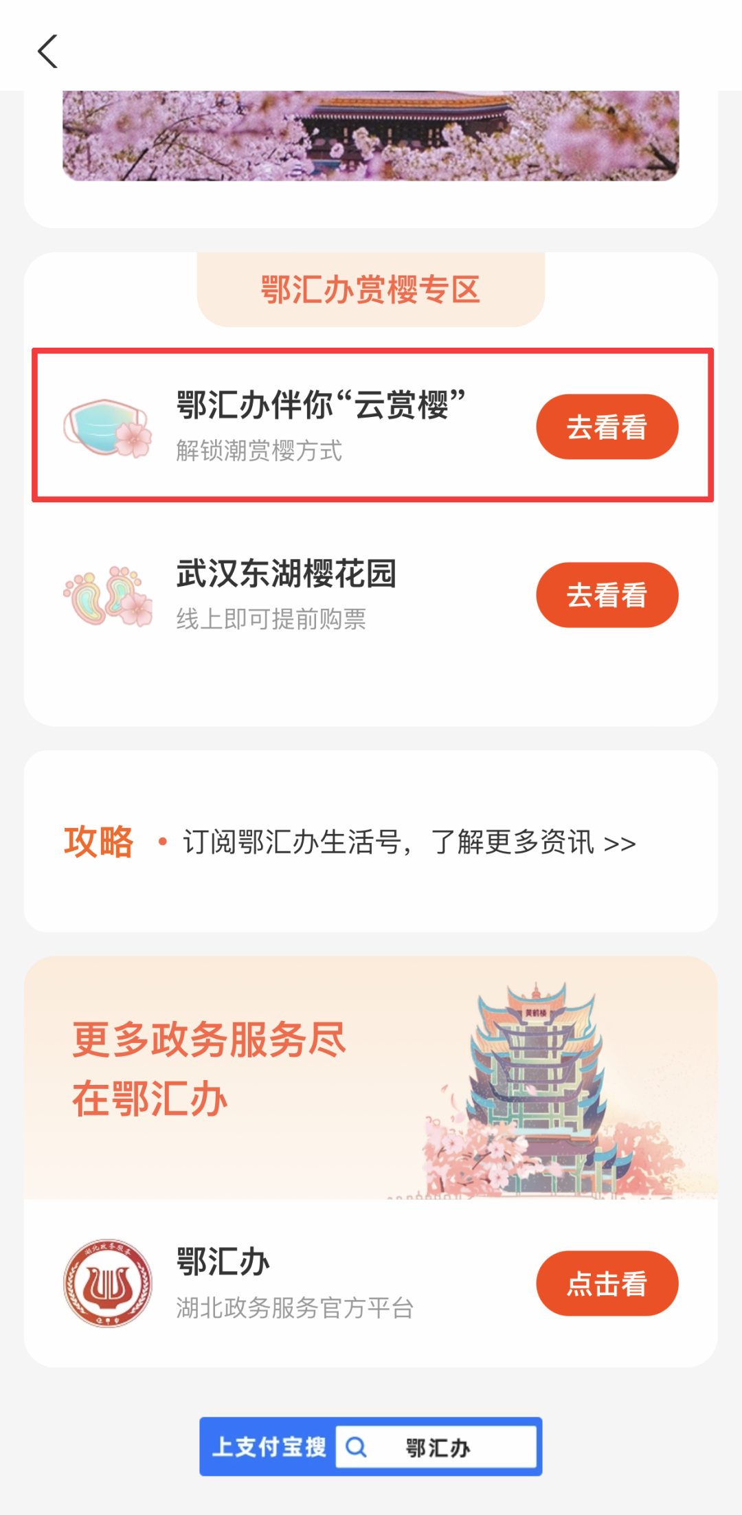 在鄂汇办支付宝小程序中,点击首页的横幅图片,进入赏樱专区。