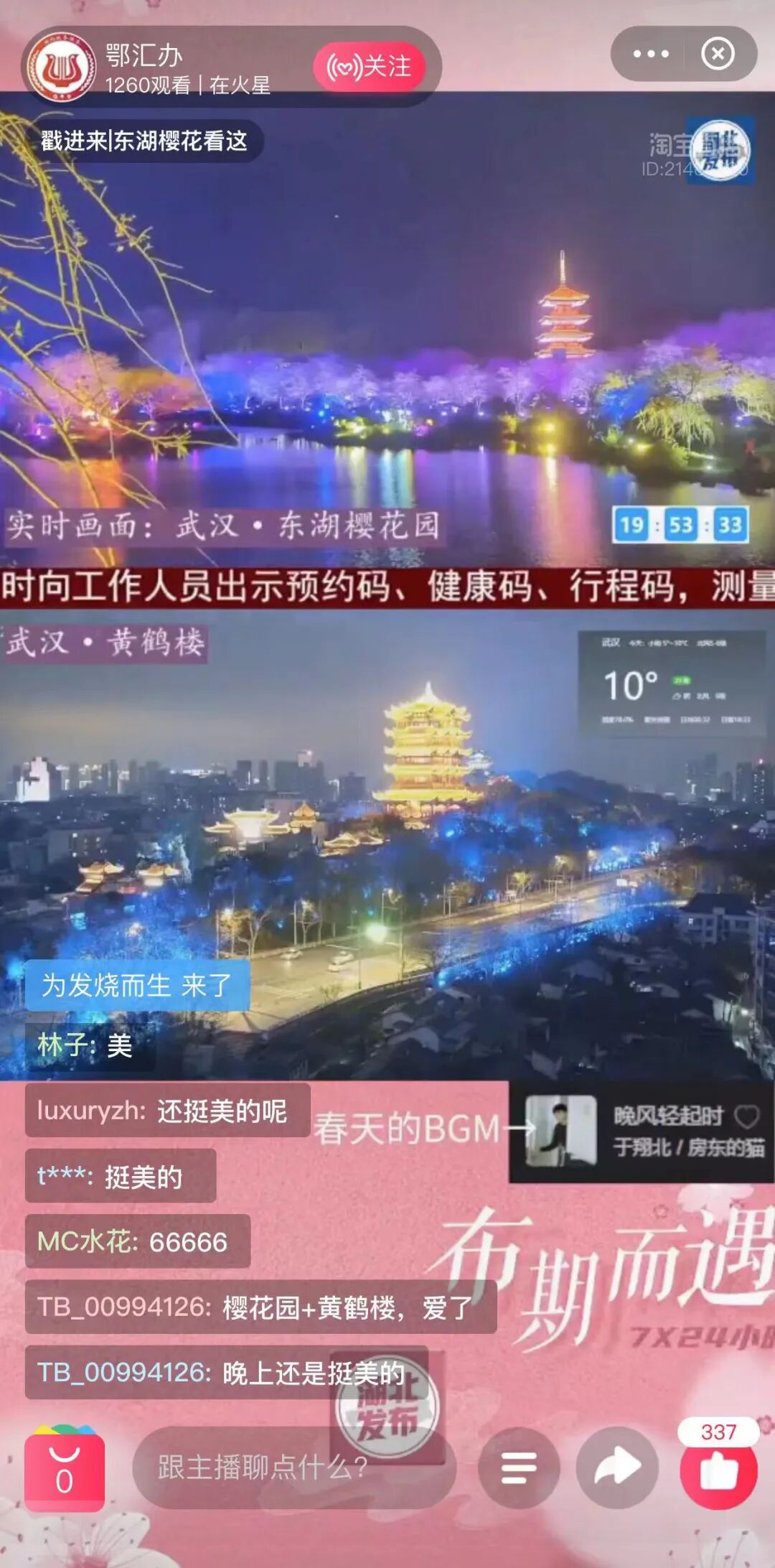 滑动界面,点击【鄂汇办伴你“云赏樱”】,即可进入全天候赏樱直播间,解锁赏樱新风潮~
