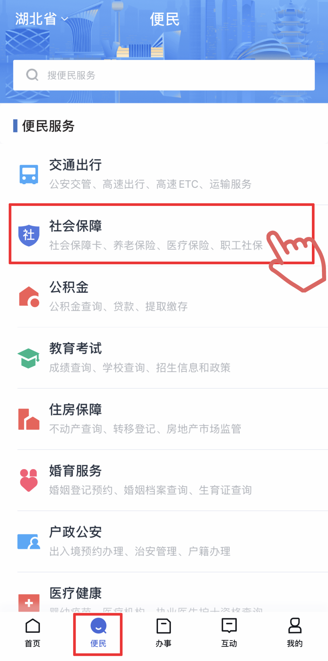 大家还可以选择底部“便民”按钮,点击“社会保障”,查看更多社保相关服务哦~