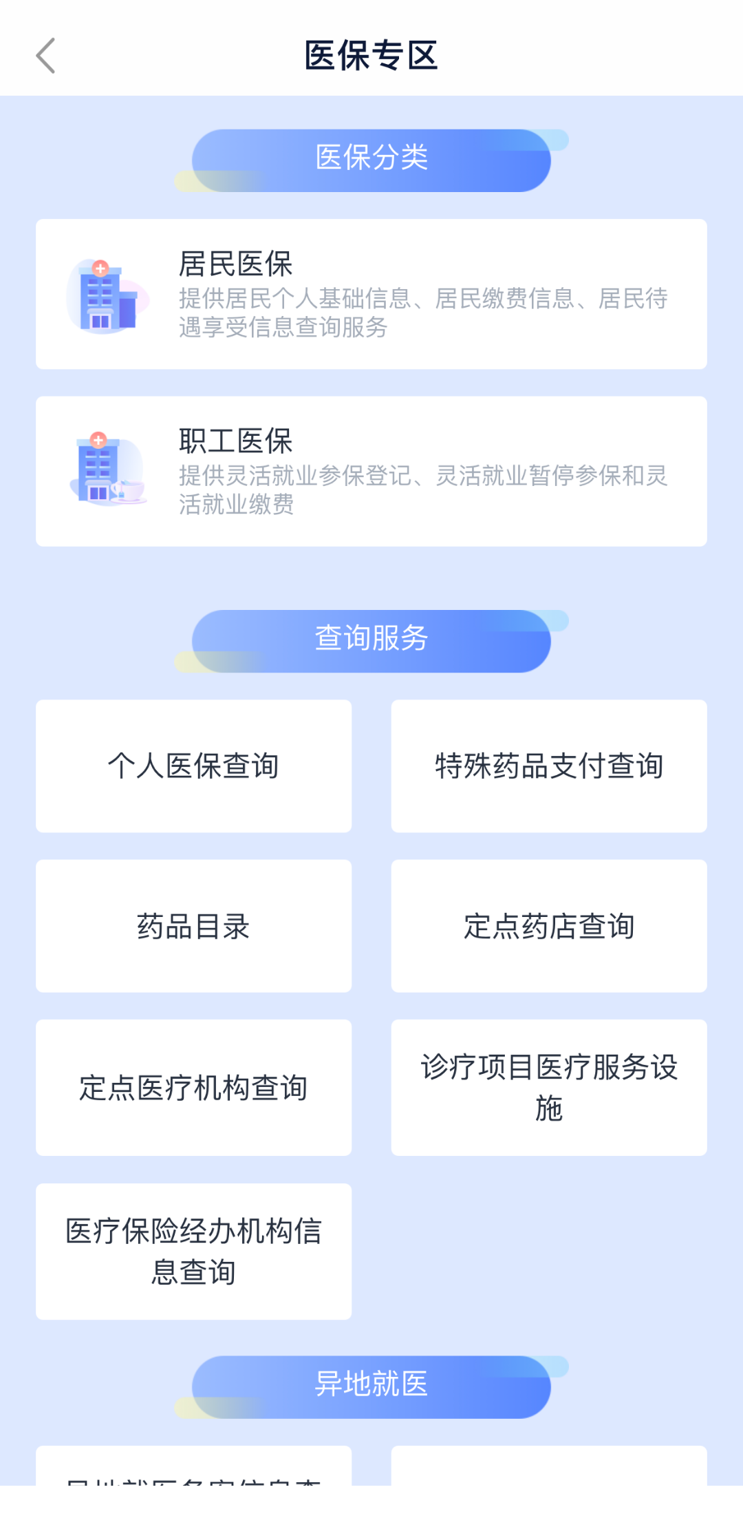 进入医保专区后,可以进行城乡居民医保缴费(当前不在缴费期)、灵活就业人员医保缴费,还可办理异地就医备案等服务。