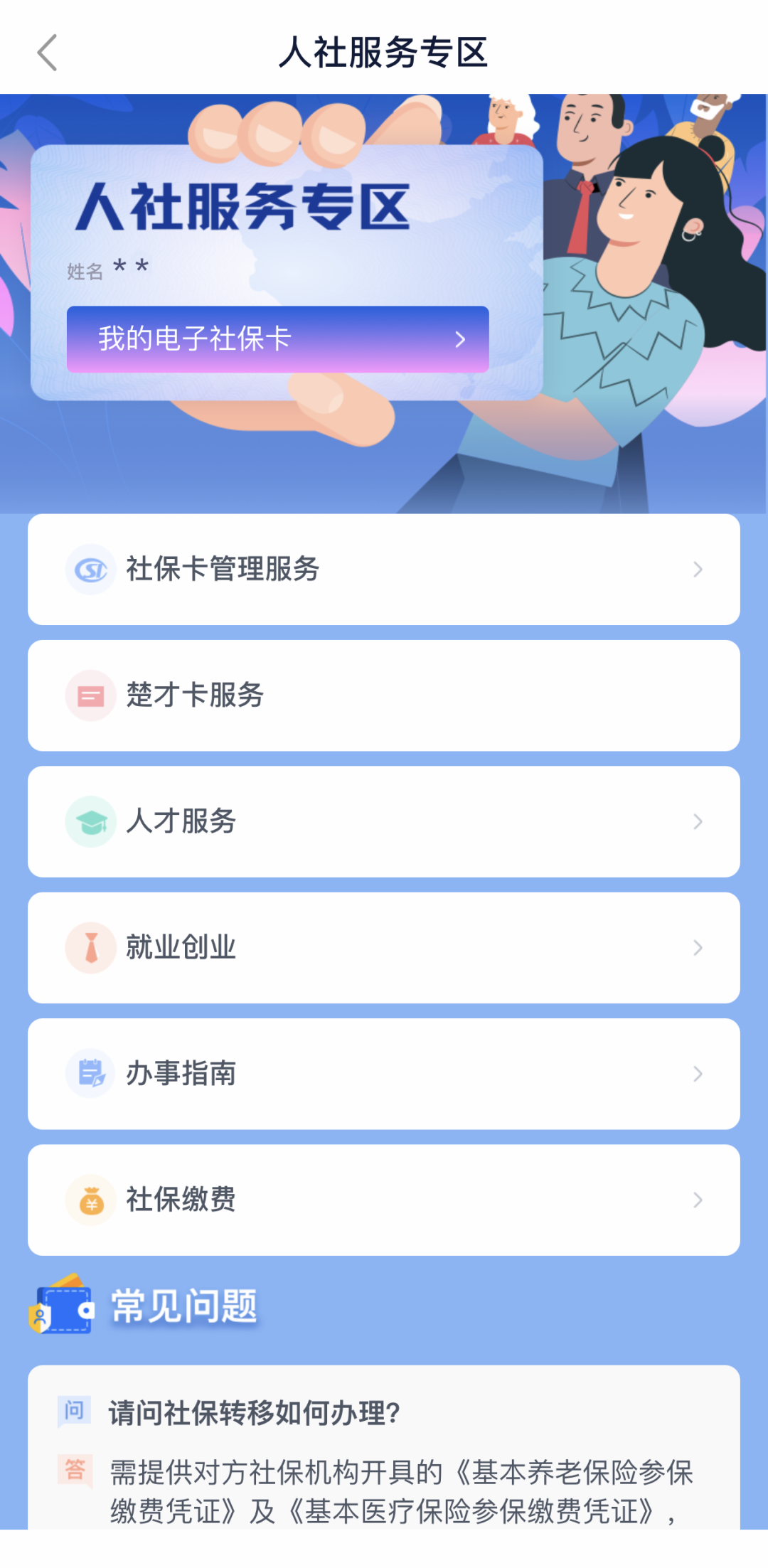 进入人社服务专区后,可以使用社保卡管理服务、社保缴费服务等,还可关注就业创业、人才服务,并可查看办事指南、常见问题等内容。