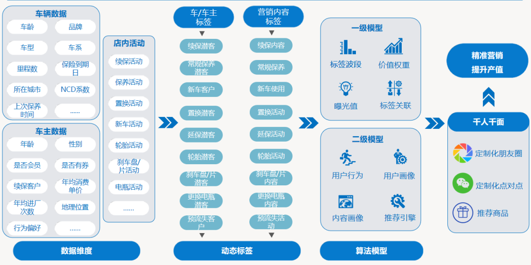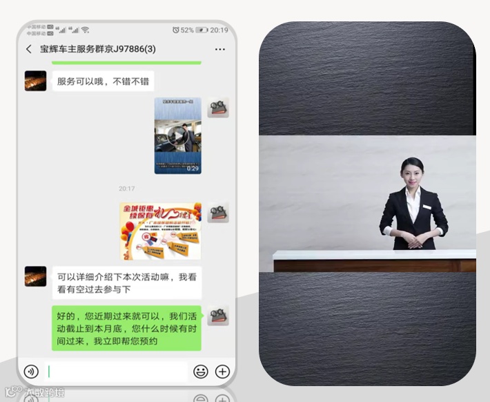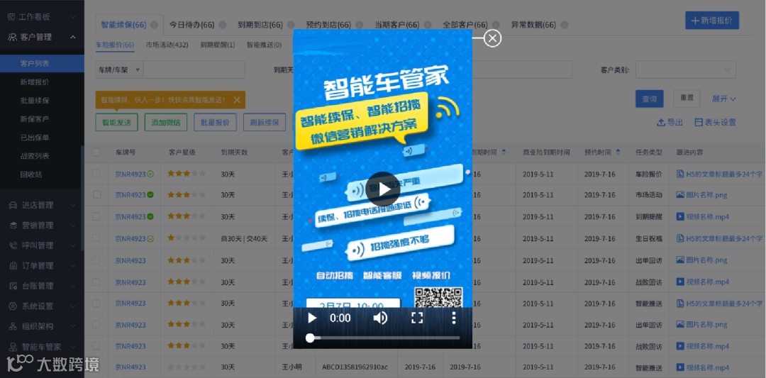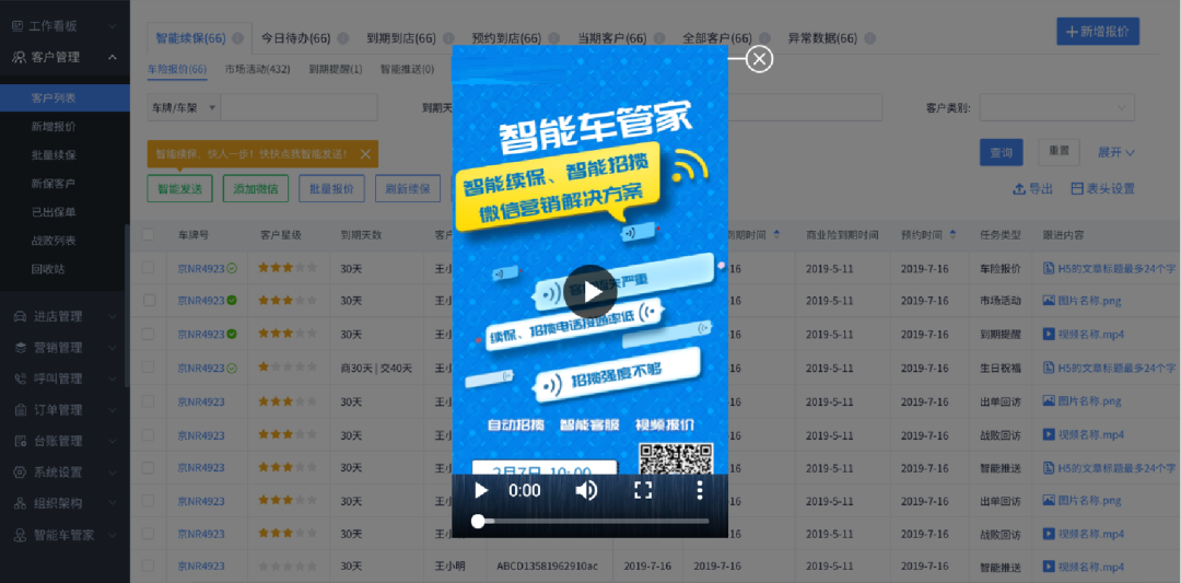 海报、视频等丰富的营销形态,改变传统的电话、短信沟通方式。车管家自动生成车险报价、保养招揽、事故车招揽、活动招揽等视频自动推送给车主,根据人工智能算法实行千人千面精准营销。
