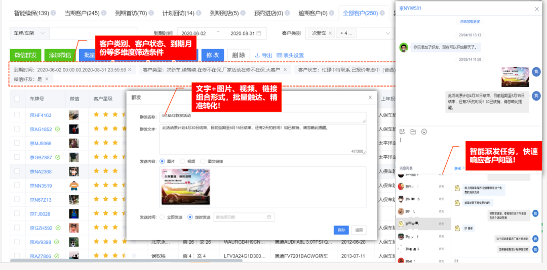 客户资料存储于企业微信,数据完全归属企业,员工流失不会带来客户流失,保证数据安全。 通过智能车管家的批量群发功能实现车主的高效触达