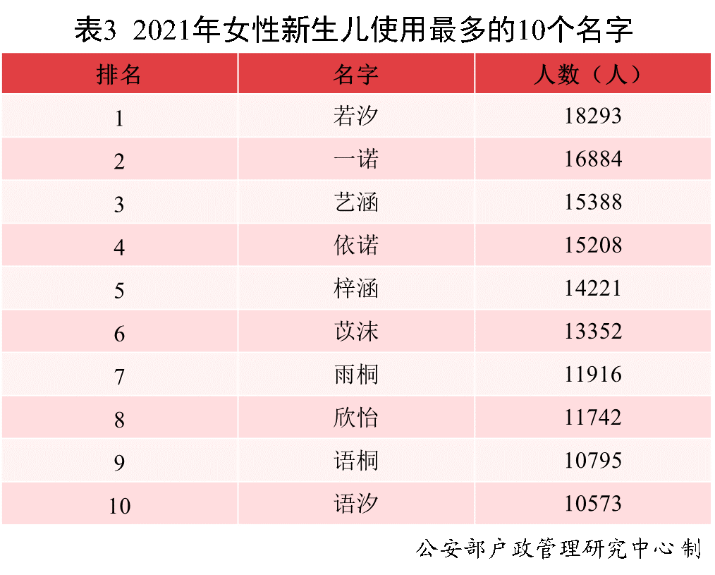 与2020年相比,若汐、艺涵、苡沫首次进入前十,其中“若汐”使用人数达到1.8万,登顶榜首,成为女性新生儿名字首选。