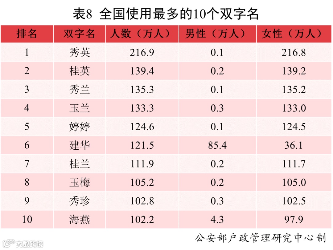 据了解,全国户籍人口中,使用频率最高的10个单字名和10个双字名如下——