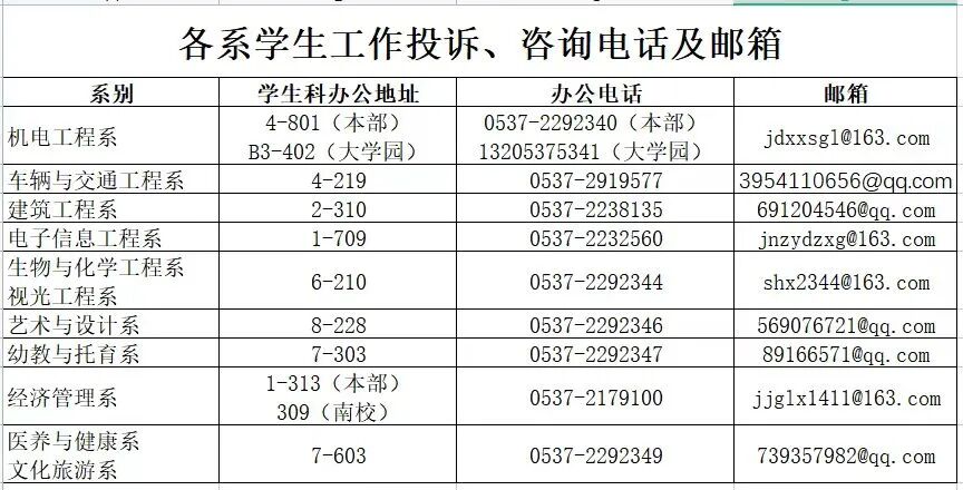 1.学生工作(学生评奖评优、违纪处分、行为规范及学风建设)咨询及学生干部监督投诉电话:0537-2238332/2221710