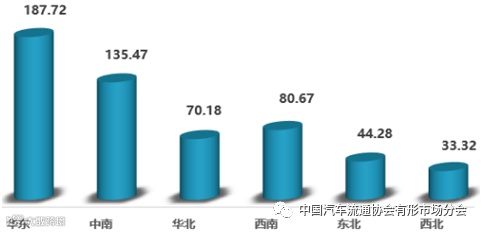 1-6月二手车六大区域交易量(万辆)分布情况: