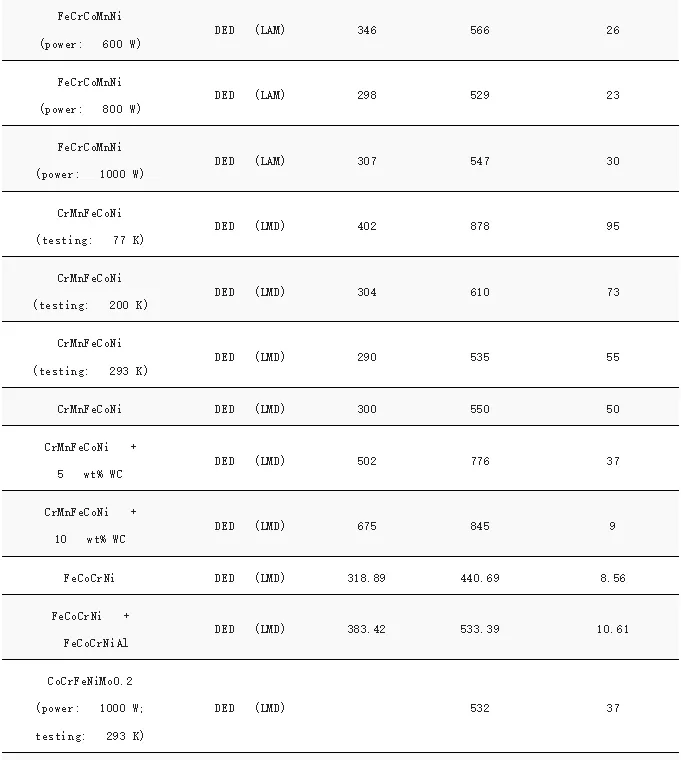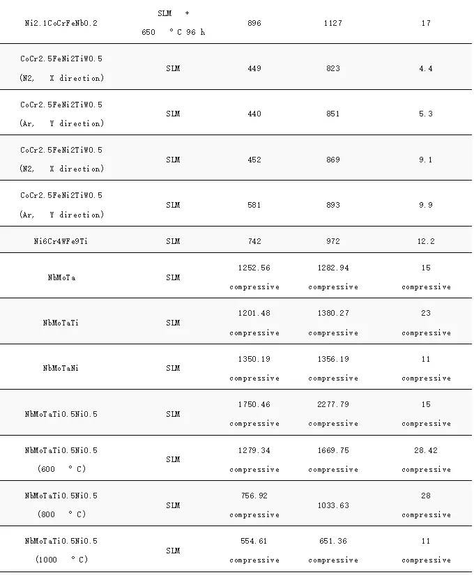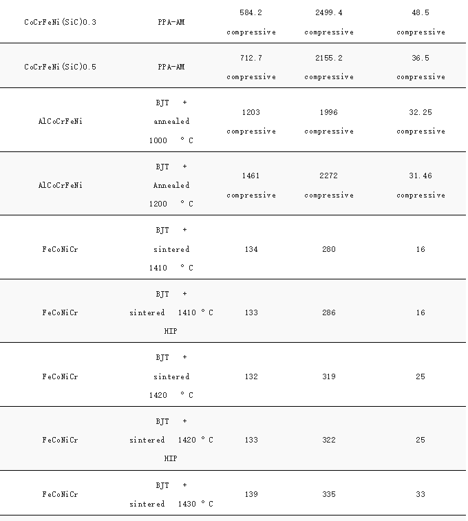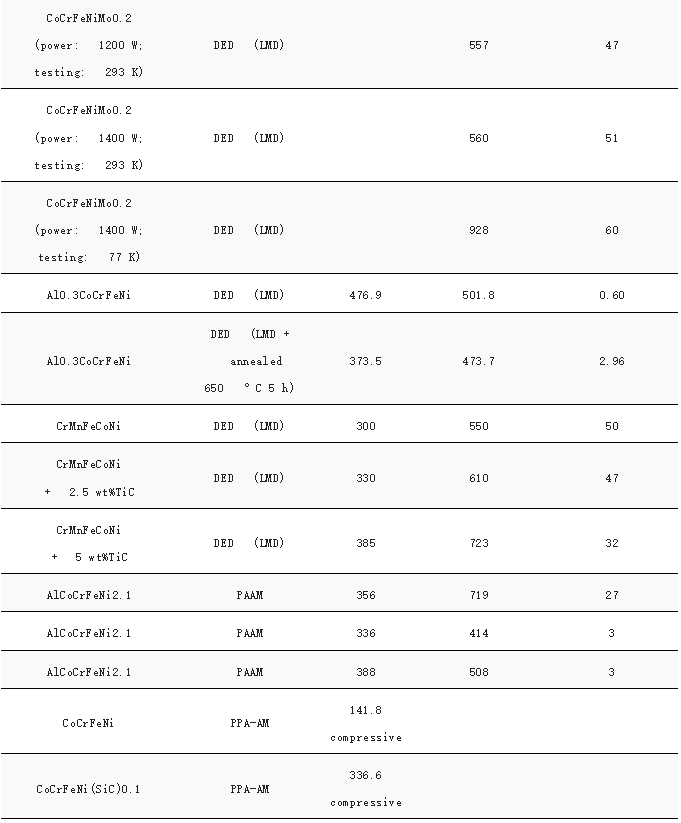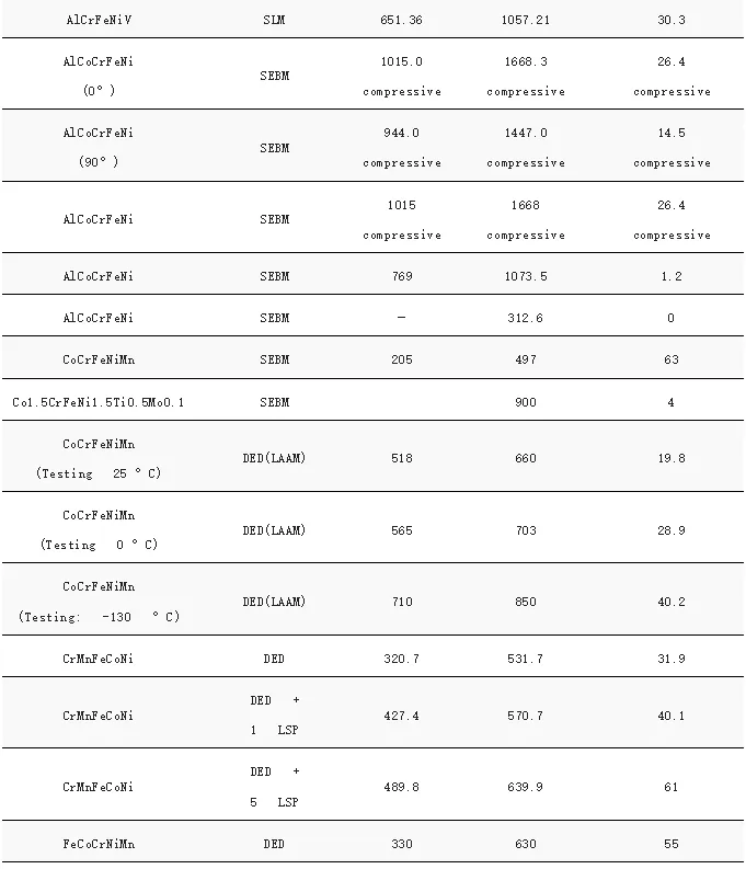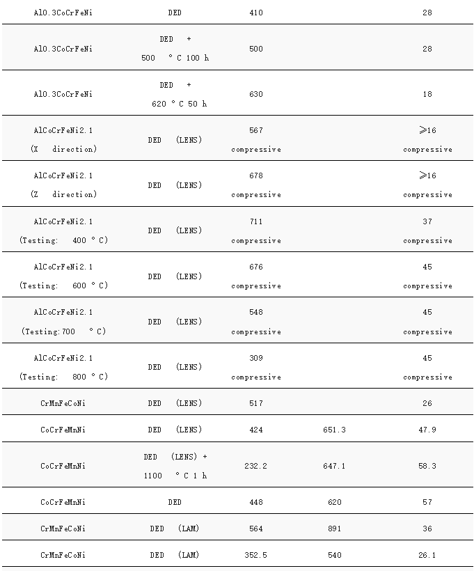 图7显示了AM加工的HEA的压缩和拉伸实验获得的强度和延展性,具体合金成分和性能列于表1中。比较SLM和DED生产的HEA的性能,可以观察到SLM加工的HEA通常比DED制造的HEA具有更高的强度。相比之下,BJT生产的HEA具有最低的抗拉强度,尽管它们的抗压强度相对较高。