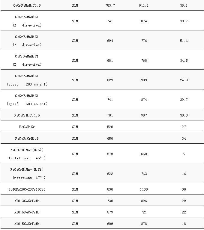 D.Lin等人使用SLM合成了Si含量为1.5at.%的FeCoCrNi HEA,揭示了单相FCC固溶体的柱状晶粒,没有形成第二相。其强拉伸性能归因于固溶和位错强化。