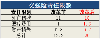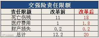 ①交强险总责任限额:12.2万元→20万元