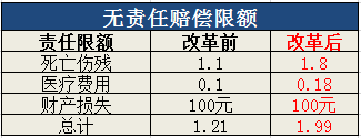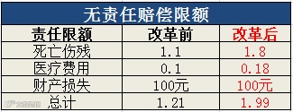 无责任赔偿限额按照相同比例进行调整,其中死亡伤残赔偿限额从1.1万元提高到1.8万元,医疗费用赔偿限额从1000元提高到1800元,财产损失赔偿限额维持100元不变。