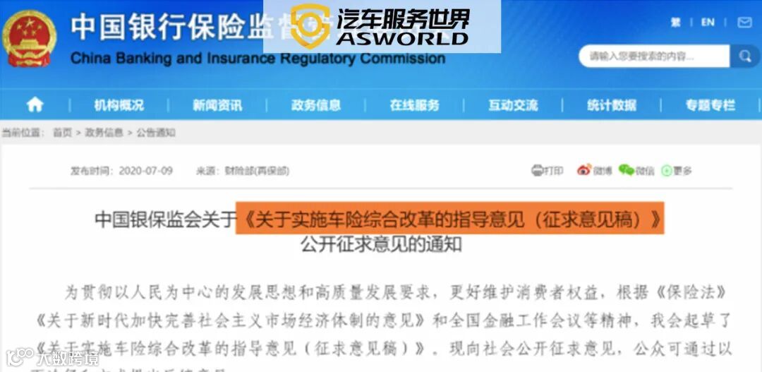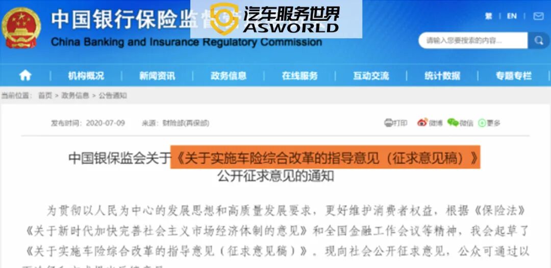 7月9日,银保监会官网发布通告:中国银保监会就《关于实施车险综合改革的指导意见(征求意见稿)》(以下简称《指导意见》)公开征求意见。