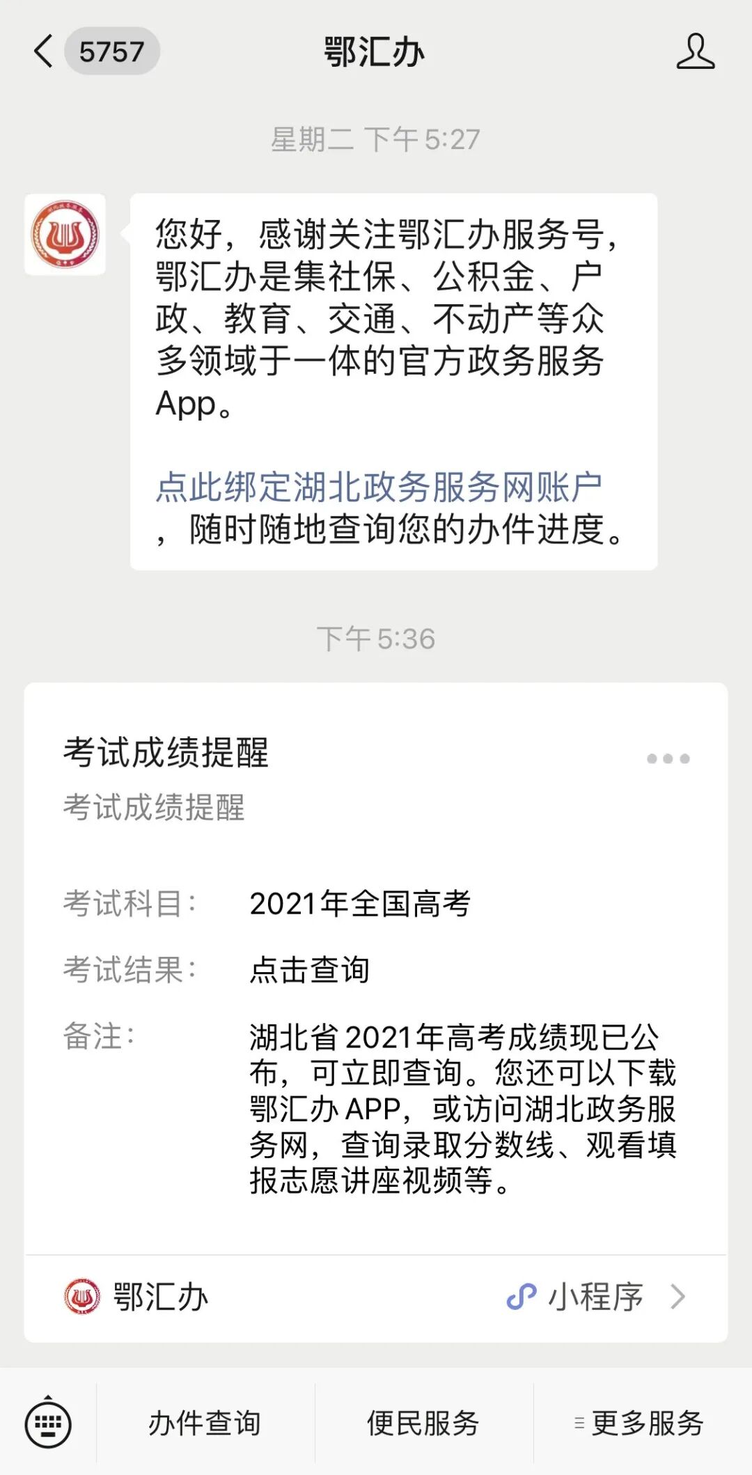 第三步:点击模板消息,进入“鄂汇办”小程序查询高考分数
