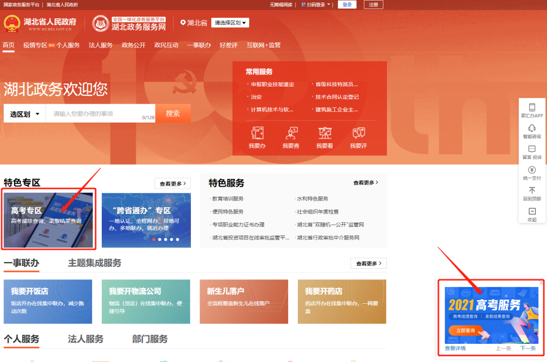 一、进入湖北政务服务网(http://zwfw.hubei.gov.cn/),点击高考专区