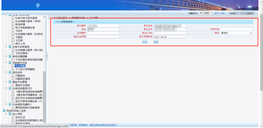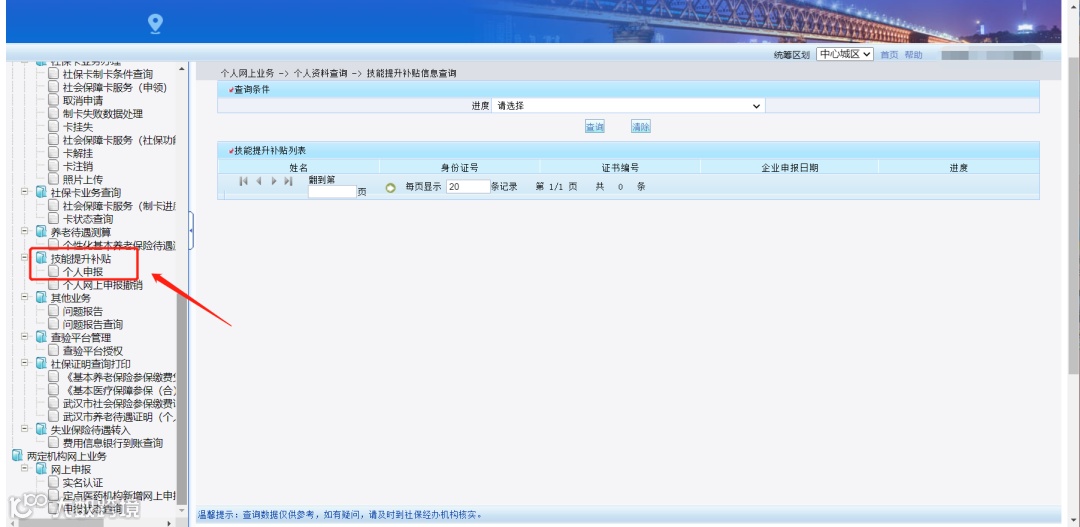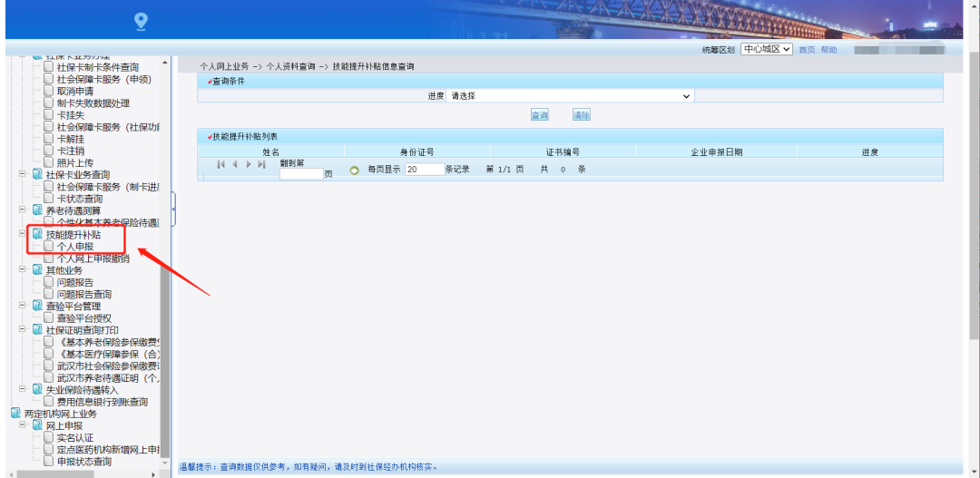 第二步:点击“(个人)武汉市社会保险公共服务平台”,进入“技能提升补贴”中的“个人申报”模块;