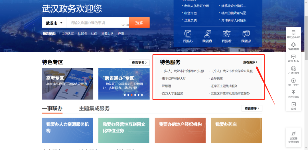 第一步:登录湖北政务服务网(http://zwfw.hubei.gov.cn/),选择“武汉市”,进入页面“特色服务”栏;