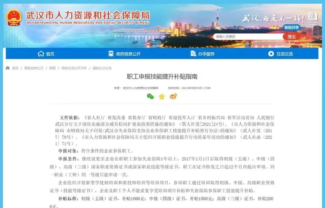 近日,武汉市人社局网站发布《职工申报技能提升补贴指南》(以下简称《指南》)。补贴标准分为三档,初级(五级)证书补贴1000元;中级(四级)证书补贴1500元;高级(三级)证书补贴2000元。