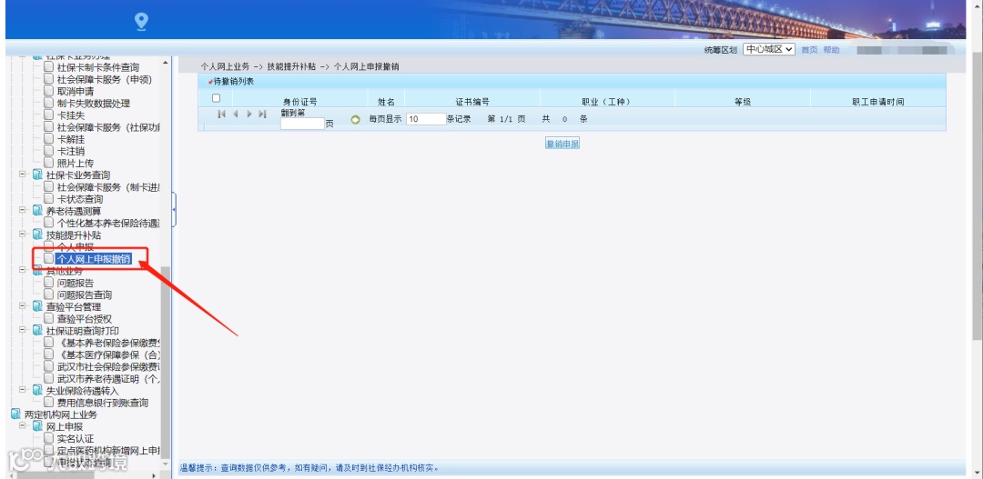 点击“技能提升补贴”目录下的“个人网上申报撤销”,在“待撤销人员列表”中选择拟撤销信息,点击“撤销申报”,系统提示“保存成功”,点击“确定”,方可完成撤销申报。
