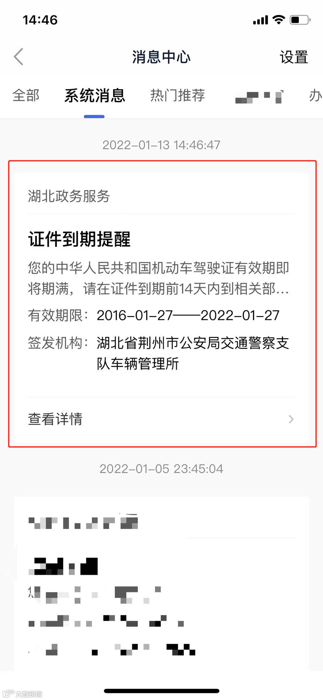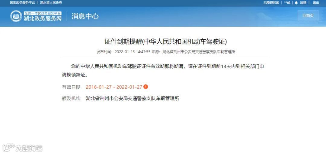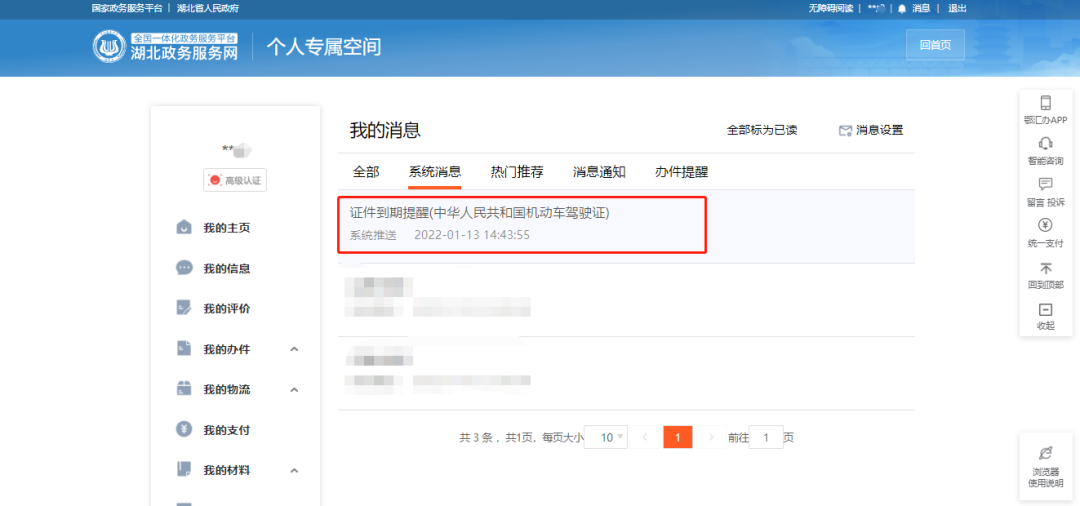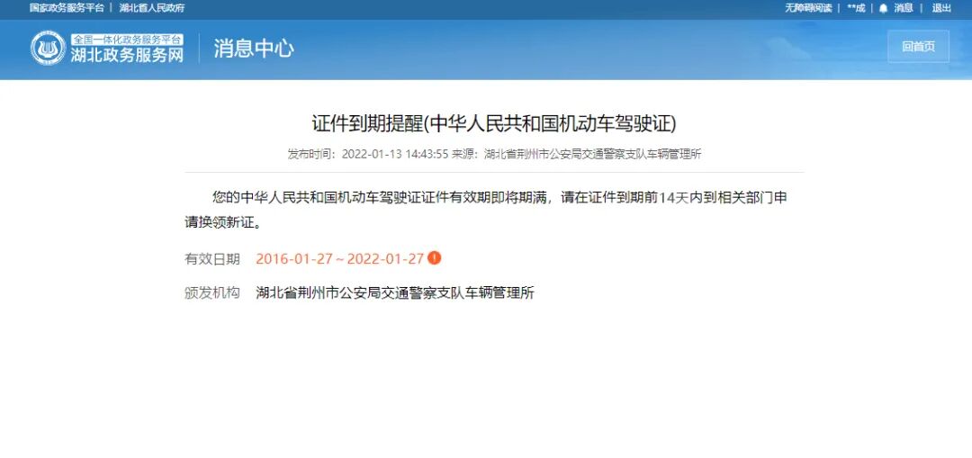 1.进入并登录湖北政务服务网(http://zwfw.hubei.gov.cn/),点击消息即可查看到期提醒内容。
