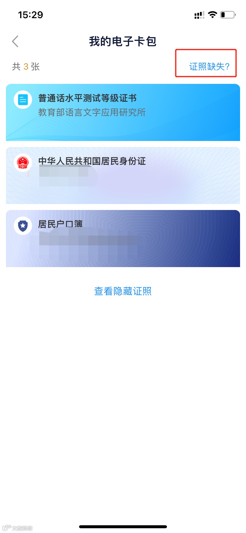 如果在电子卡包中没有找到已拥有纸质证照对应的电子证照,可以根据一下操作流程进行申请补发: