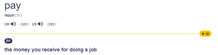 pay作“薪水”时是不可数名词,包含salary和wages,不论工作性质如何,针对劳动所支付的报酬。