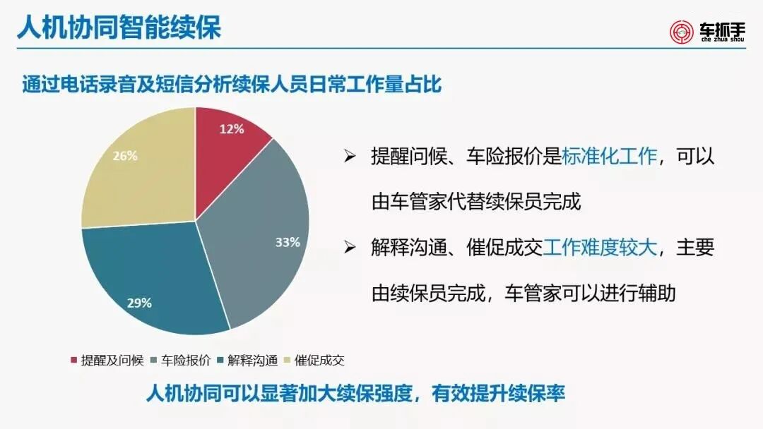 传统招揽过程中,续保专员的工作内容杂乱,效率低下,智能车管家完成人机协同后,标准化工作由车管家自动完成,个性化、非标准工作由续保专员完成,将会显著加大续保强度,有效提升续保率。