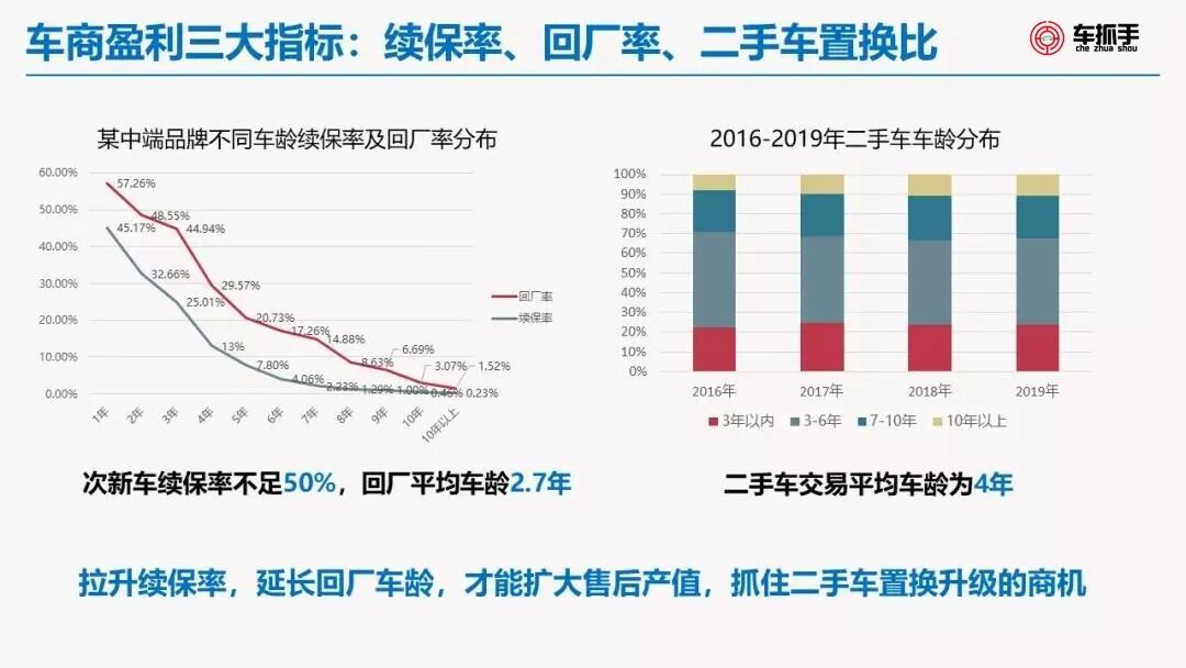 得出的结论就是:拉升续保率,延长回厂车龄,才能扩大售后产值,抓住二手车置换升级的商机