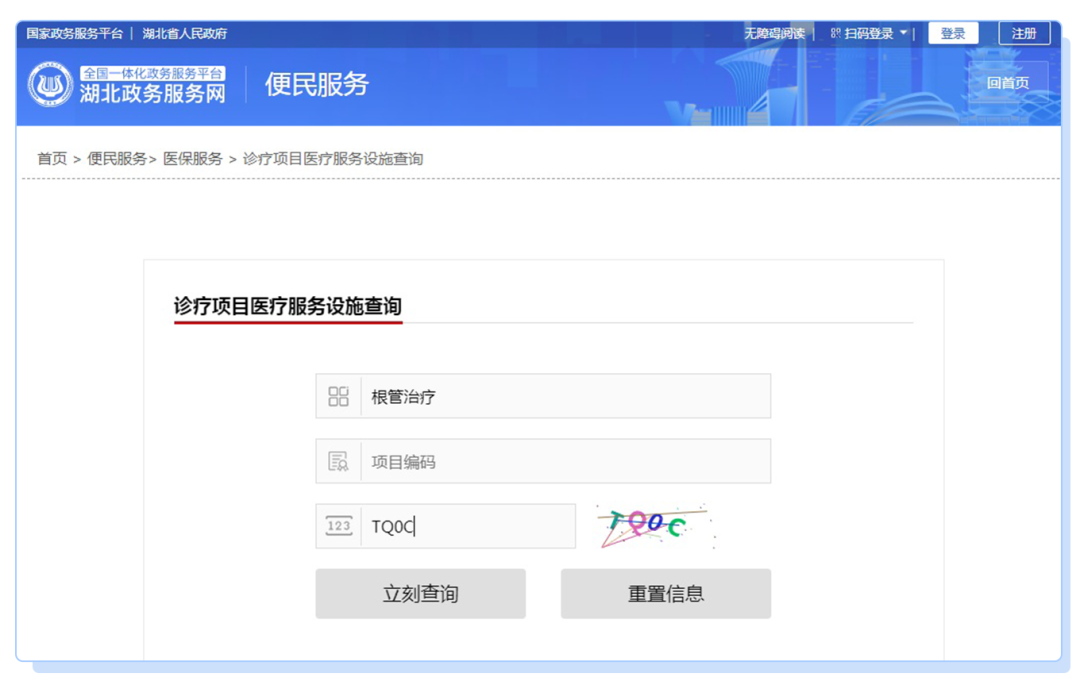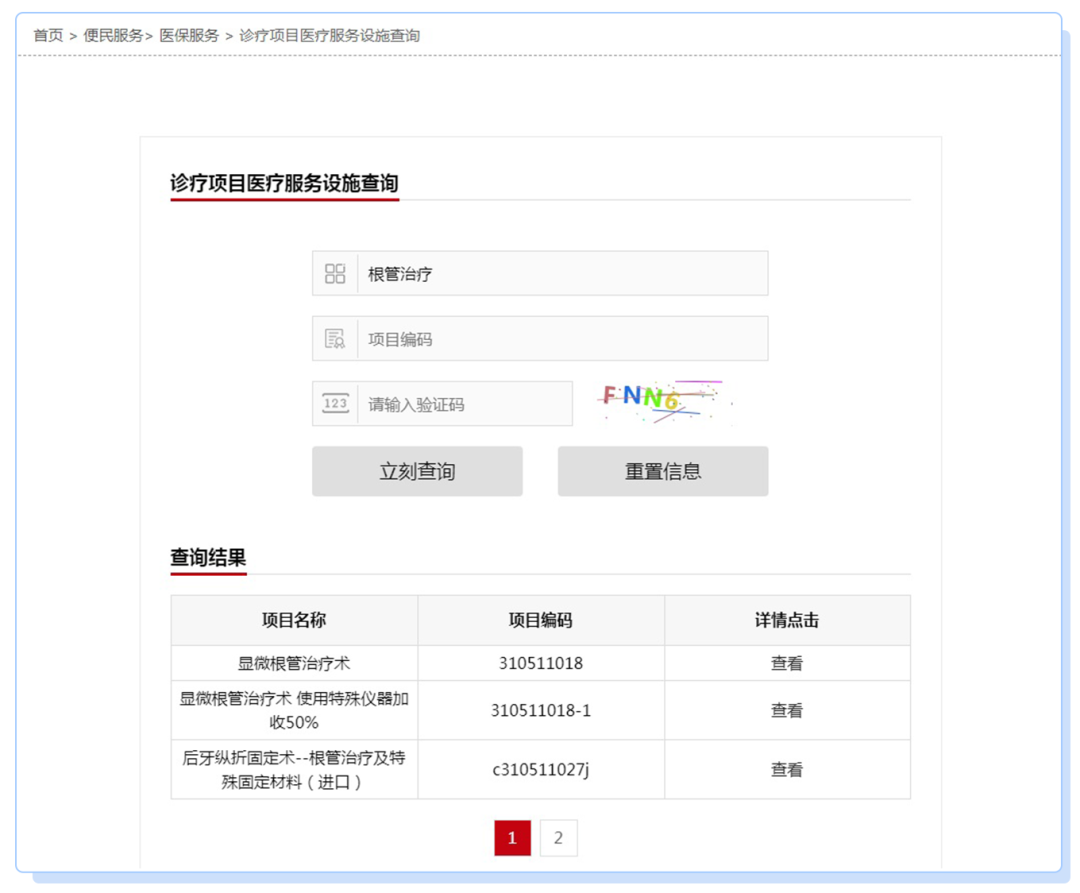 进入诊疗项目医疗服务设施查询,输入项目名称,如“根管治疗”,点击查询,即可查看相关信息: