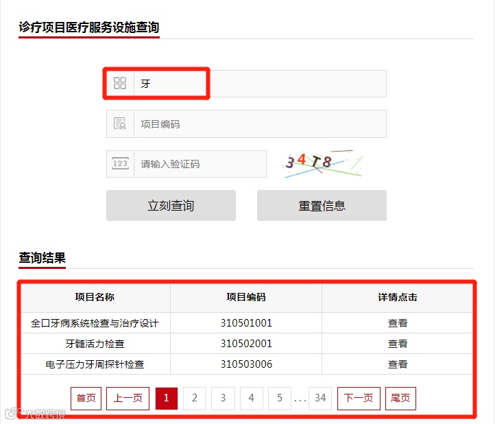 进入查询页面,按需搜索。如,在【项目名称】一栏中输入“牙”,即可显示: