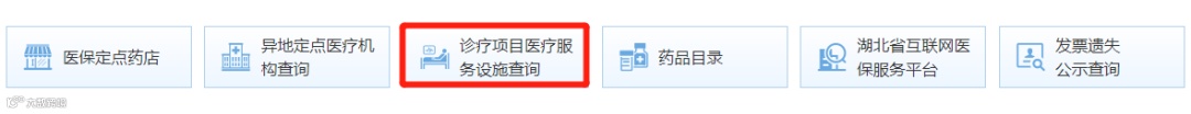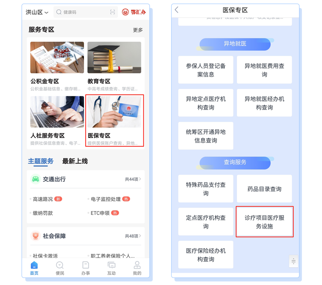 打开鄂汇办APP,进入医保专区,选择查询服务—诊疗项目医疗服务设施;